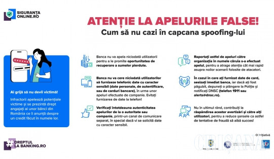 Poliția Română, Directoratul Național de Securitate Cibernetică și Asociația Română a Băncilor atrag atenția, prin intermediul proiectului național de conștientizare #SigurantaOnline, asupra creșterii fraudelor de tip „spoofing”.