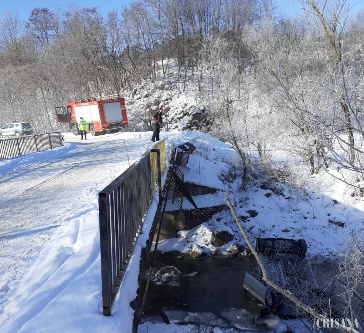 O mașină cu patru persoane a plonjat, luni, într-un râu, după un viraj la dreapta ratat din cauza vitezei şi a drumului înzăpezit. Toți patru au ajuns la spital.