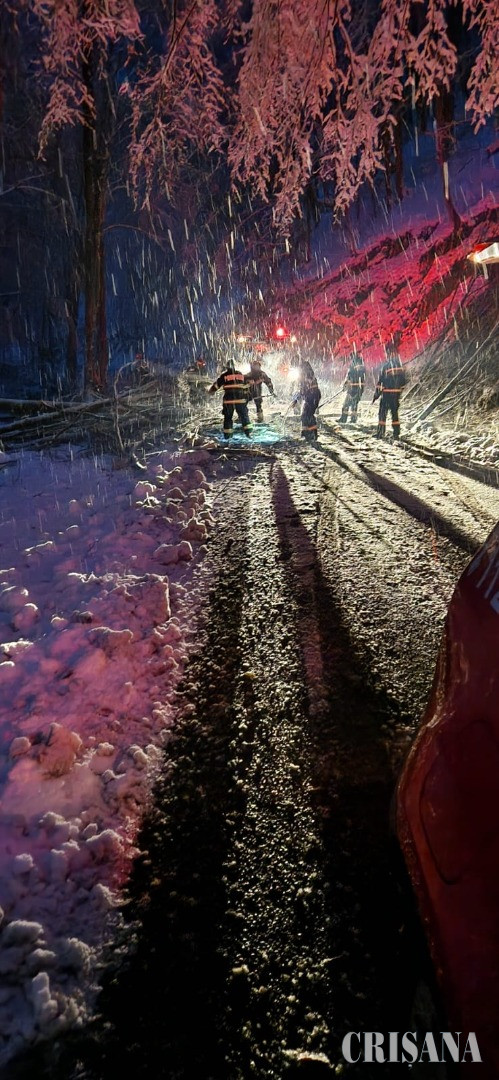 Timp de aproape 12 ore, în noaptea de vineri spre sâmbătă, pompierii militari bihoreni s-au chinuit să înlăturare copacii prăbușiți pe carosabil din cauza căderilor masive de zăpadă în zona Pădurea Neagră.