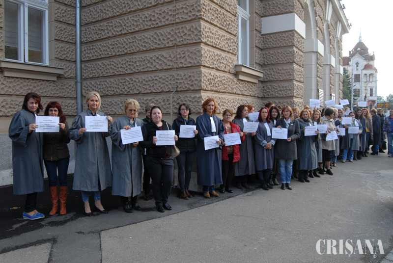 După ce la începutul lunii februarie, grefierii bihoreni au intrat în grevă japoneză, nemulţumiţi de salarizare şi de inechităţile din sistem, săptămâna aceasta, protestele au continuat. Marţi, aproximativ 60 de persoane au protestat în faţa Palatului de Justiţie din Oradea, acţiunile fiind programate să continue şi zilele următoare. Miercuri însă, la ora 12.00, atunci când grefierii ar fi trebuit să protesteze în faţa instanţelor, liderii sindicaliştilor au anunţat că manifestările au fost suspendate. „Suspendăm protestele deoarece avem promisiuni că ministrul justiţiei se va întâlni cu liderii noştri. Mergem pe calea dialogului social. Credem că susţinerile ministrului sunt neadevărate, dar îi dăm şansa să ne dovedească contrariul”, a declarat Nicoleta Sîrmă, grefier în cadrul Judecătoriei Oradea, reprezentanta SindJust Bihor. Grefierii sunt nemulţumiţi nu doar de noua grilă de salarizare, care a dus la scăderea salariilor în unele cazuri, ci şi de faptul că nu au un statut, de lipsa de personal sau lipsa unui contract colectiv de muncă. „70% dintr-un dosar este munca grefierului. Un grefier avea salariul echivalent cu 70% din salariul unui judecător. Acum, avem aproximativ 30%. Din 2010 au început problemele. Nu ni se respectă drepturile, nu primim nici ceea ce ar trebui să primim prin lege. În plus, pe lângă vechimea necesară, există o limită de vârstă de 60 de ani pentru a putea ieşi la pensie. Aceasta este o meserie care nu se poate face până la 60 de ani. Avem atâţia colegi care s-au îmbolnăvit din cauza stresului şi a condiţiilor de muncă, mulţi dintre ei nici nu au mai apucat să ajungă la pensie”, a menţionat Nicoleta Sîrmă. Reprezentanta SindJust a apreciat că, în opinia grefierilor, ministrul justiţiei este mai preocupat de soarta deţinuţilor decât de cea a angajaţilor din sistem. „Credem că domnul Toader se gândeşte mai mult la deţinuţi decât la angajaţi. Sunt magistraţi cocoşaţi de muncă. Noi am lucrat în condiţii mult mai rele, până la renovarea Palatului de Justiţie, decât condiţiile din penitenciare. La noi s-a rezolvat, dar în ţară nu. Şi noi lucrăm, nu stăm întinşi pe un pat aşteptând să vină o sentinţă. Concluzia la care eu am ajuns este că justiţia nu este coruptă, justiţia este obosită”, a mai declarat Nicoleta Sîrmă.
