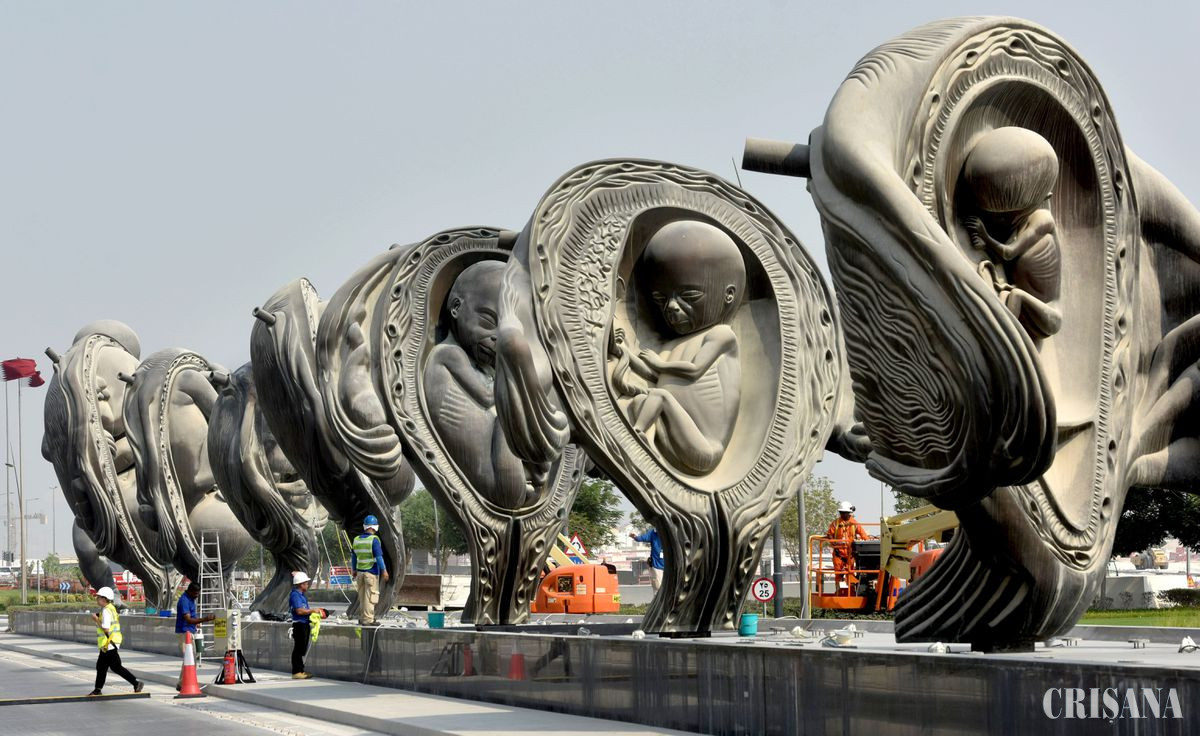 Artistul britanic Damien Hirst a stârnit din nou controverse după ce 14 sculpturi din bronz uriașe ale sale, care prezintă grafic drumul de la concepție la naștere, au fost dezvelite în fața Spitalului Sidra din Doha, Qatar.