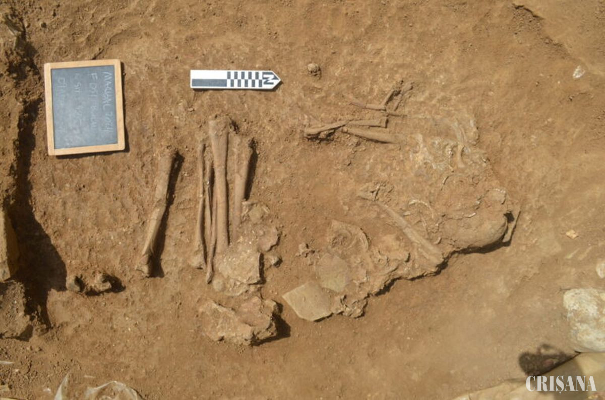 Cu prilejul cercetărilor a fost descoperit scheletul unui copil de aproximativ 10 ani, alături de cel al unui animal, precum și un vârf de săgeată de os, scrie G4Media.ro