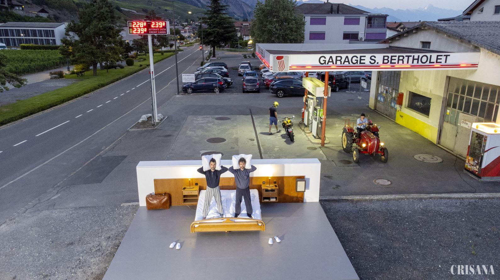 Camera de hotel a artiştilor conceptualişti elveţieni constă, în esenţă, dintr-un pat dublu pe o platformă, cu două noptiere şi veioze. Nu există pereţi, tavan sau uşi care să ofere intimitate sau adăpost. Cei doi au înfiinţat camera de hotel de zero stele pe marginea unui drum, lângă o benzinărie din satul Saillon, în cantonul Valais, din sudul Elveţiei. Intenţia a fost de a-i determina pe oaspeţi să se gândească la problemele cu care se confruntă lumea şi de a-i inspira să acţioneze în mod diferit, după cum au explicat fraţii gemeni. Ei au mai creat paturi similare în locuri idilice, însă aceasta este prima lor cameră „anti-idilică".