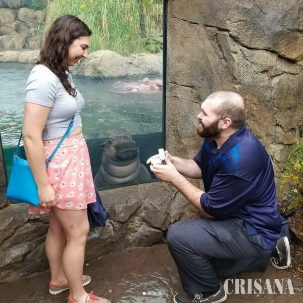 Nick Kelble și iubita sa Hayley Roll o vizitează în mod regulat pe Fiona și au fost încântați că animalul lor preferat a fost martor la eveniment. „Suntem atât de fericiți că Fiona a putut fi acolo cu ocazia zilei noastre speciale”, a scris fericita viitoare mireasă într-un mesaj publicat pe Instagram. „Ne-am dus la grădina zoologică pentru aniversarea noastră de un an, iar Fiona era la geam”, a adăugat ea pentru Daily Buzz. „Împreună cu iubitul meu, Nick, așteptam la rând ca să facem fotografia cu Fiona, iar eu am dat telefonul mobil cuiva ca să ne fază poza, iar când m-am întors Nick era în genunchi pentru a mă cere în căsătorie”, a explicat Hayley Roll. Fiona a devenit primul hipopotam de Nil născut la Grădina Zoologică din Cincinnati în ultimii 75 de ani. Ea a venit pe lume în luna ianuarie și s-a luptat să supraviețuiască după ce mama ei a născut-o cu șase săptămâni înainte de termen. „Hipopotamii născuți la termen cântăresc în mod obișnuit între 22 și 50 de kilograme”, potrivit informațiilor grădinii zoologice. „La nașterea sa prematură cu șase săptămâni, Fiona a avut o greutate de doar 13 kilograme. Ea este cel mai mic hipopotam care a supraviețuit vreodată”. Reprezentanții grădinii zoologice au declarat că Fiona este un „hipopotam micuț, cu o personalitate mare”. „Pe măsură ce Fiona continuă să crească, încep să iasă la suprafață multe fațete ale personalității ei complexe!”, au adăugat aceștia la începutul anului. Începând din ianuarie, americanii a fost cuprinși de o afecțiune specială față de acest mamifer ușor greoi, ai cărui primi pași s-au transformat, în spațiul online, într-un foileton cu multe răsturnări de situație.