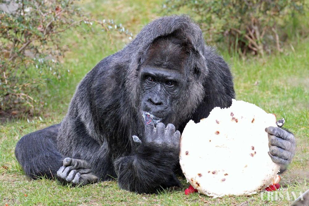 Această gorilă, care este femelă şi se numeşte Fatou, s-a născut în sălbăticie şi trăieşte la Zoo Berlin din 1959. Vinerea trecută ea a primit de la îngrijitorii săi un cadou special de ziua ei de naştere, constând în crenguţe, salată verde, struguri, banane şi pepene galben într-un coş.