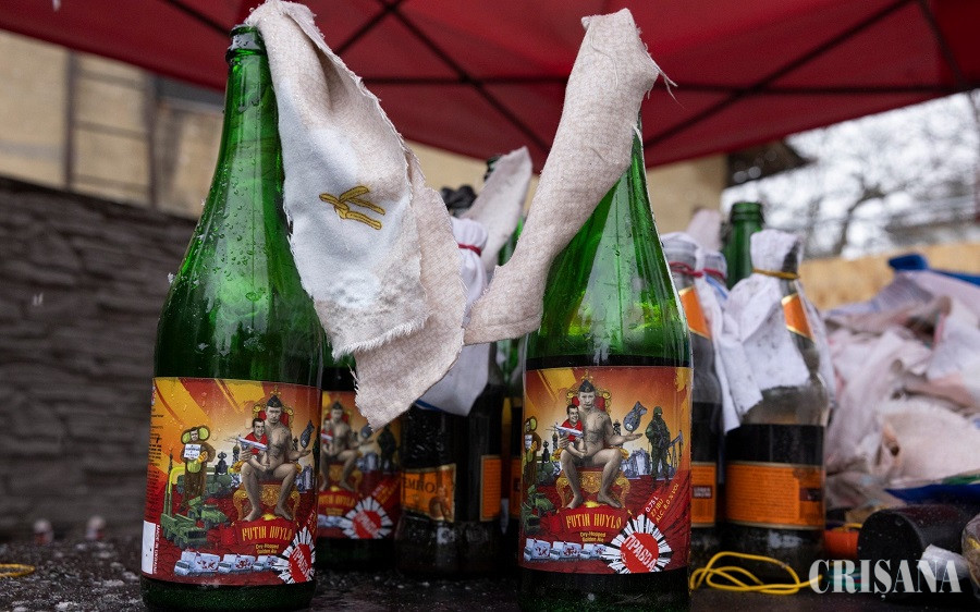 „În mai puţin de o săptămână, am produs peste 2.000 de cocteiluri Molotov, mult mai multe decât era nevoie. Deocamdată ne-am oprit”, spune Taras, arătând spre zecile de artefacte depozitate încă în clădire, pe care sunt lipite etichetele celei mai populare beri produse de Pravda, „Putin Huilo” („Tâmpitul de Putin” - n.r. EFE).