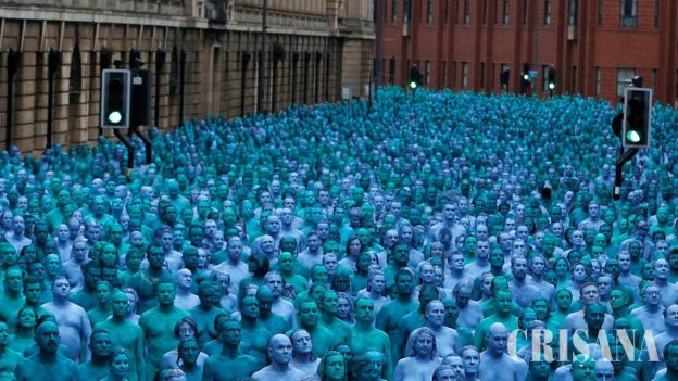 Mii de oameni dezbrăcați și pictați în albastru - Artă urbană în Anglia