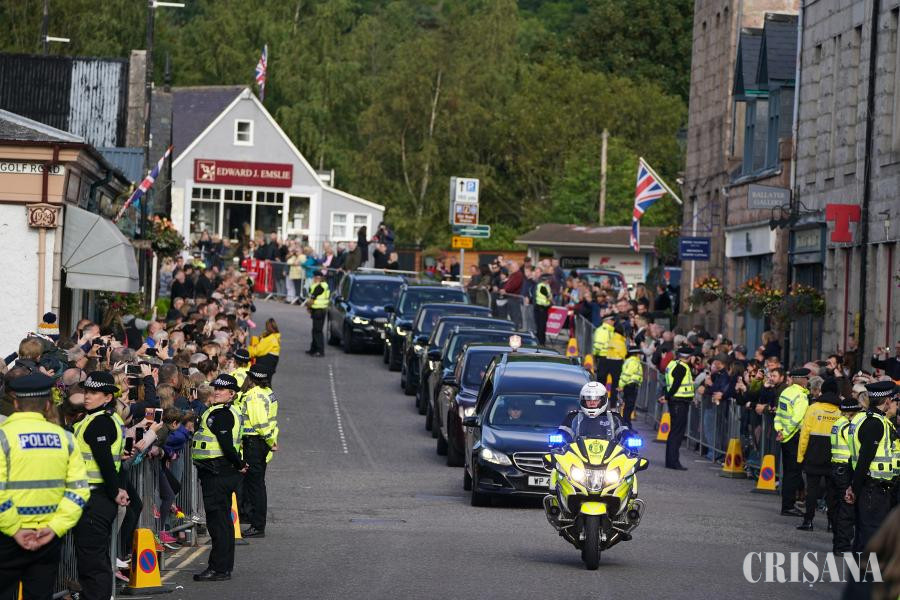Ballater a fost prima localitate traversată de cortegiu. Sute de persoane s-au aşezat de-a lungul străzii principale, mulţi dintre ei în haine negre. Clericii, dintre care unii s-au înclinat la trecerea cortegiului, şi autorităţile locale în ţinute tradiţionale scoţiene s-au aşezat în faţa bisericii. Câteva flori au fost aruncate la trecerea sicriului.