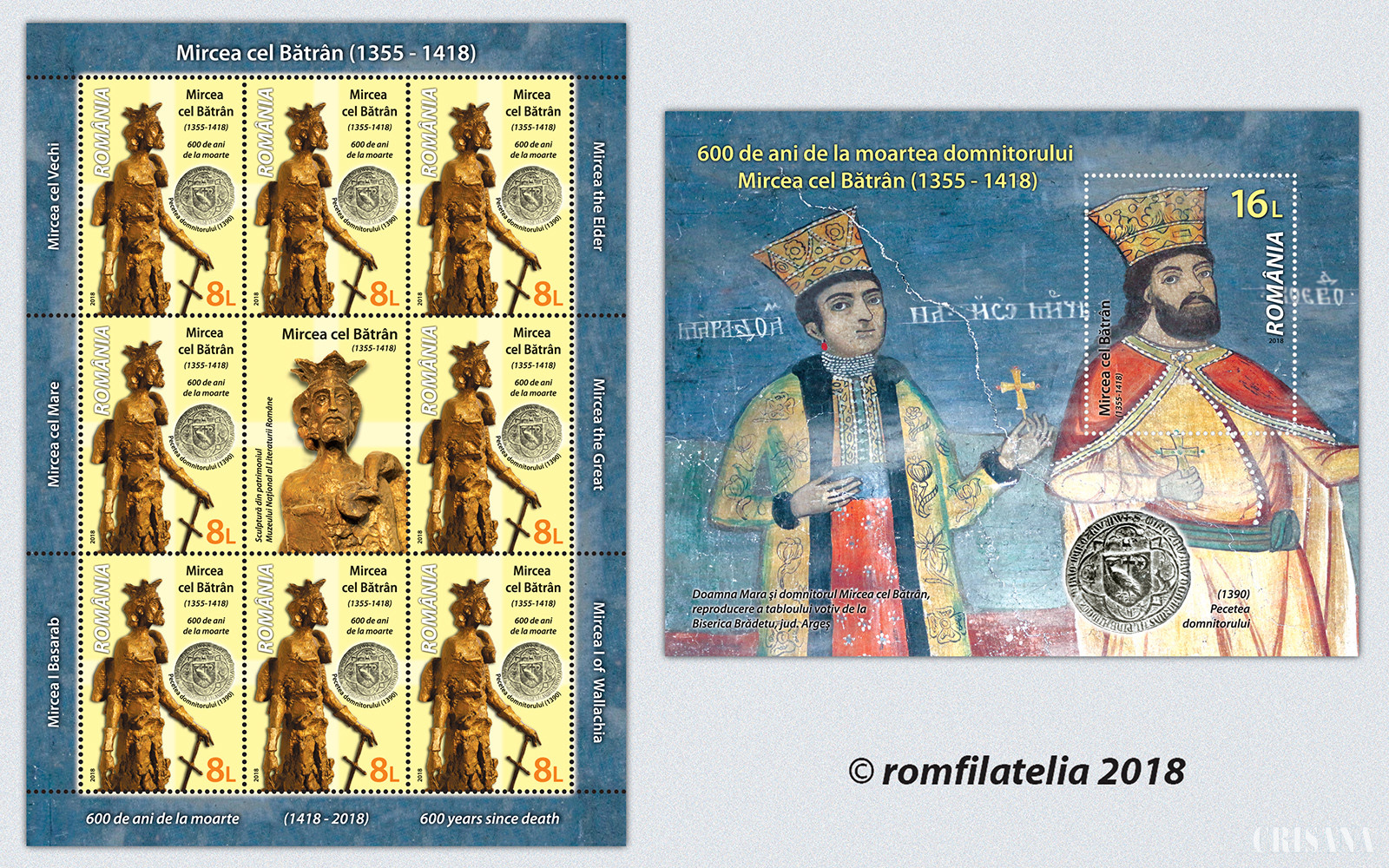 Mircea cel Bătrân, o figură emblematică a Evului Mediu românesc, a fost voievodul în timpul căruia Valahia a atins apogeul puterii sale politice și a întinderii teritoriale. Mircea nu a fost doar domn al Țării Românești, ci și senior al unor importante ținuturi transilvane și singurul stăpânitor al ținuturilor românești de la Marea Neagră. Pe timbrul cu valoarea nominală de 8 lei este ilustrată statuia lui Mircea cel Bătrân aflată în patrimoniul Muzeului Național al Literaturii Române. Opera aparține sculptorului Paul Vasilescu (1936-2012), un artist care s-a remarcat prin lucrările sale de artă monumentală și portretistică. Pe colița dantelată a emisiunii de mărci poștale este reprodusă o frescă de la Biserica Brădetu (jud. Argeș), ctitorie a lui Mircea cel Bătrân, pe care voievodul apare pictat alături de soția sa, doamna Mara. Timbrul coliței dantelate are valoarea nominală de 16 lei.