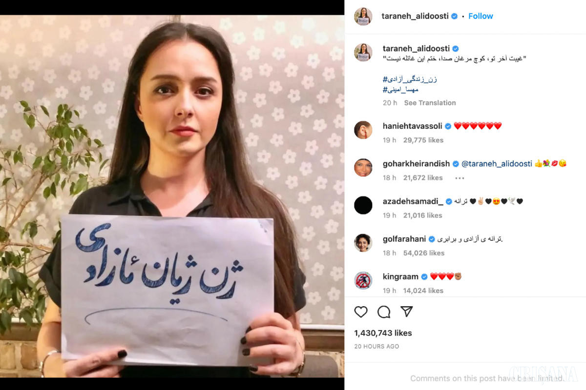 „Taraneh a fost arestată pentru că a condamnat pe Instagram execuţia lui Mohsen Shekari, primul protestatar condamnat la moarte de când au început protestele la nivel naţional în urma uciderii brutale de către poliţie a kurdei iraniene Mahsa Amini în septembrie", adaugă ei.
