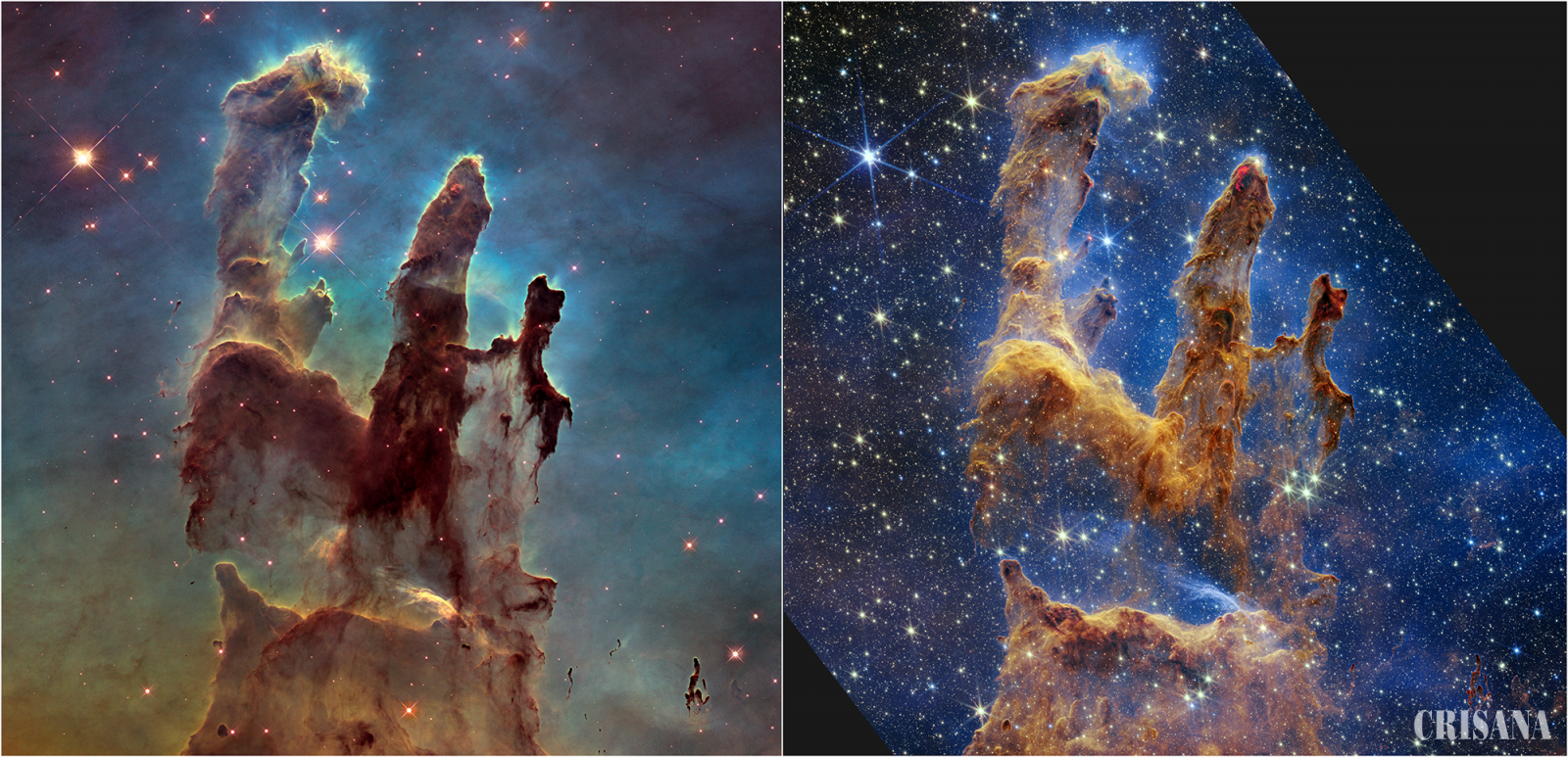 Redaţi într-o imagine mai clară şi mai amplă de instrumentele optice cu lumină vizibilă ale telescopului Hubble în anul 2014, Stâlpii Creaţiei sunt înfăţişaţi de telescopul spaţial James Webb în spectrul infraroşu apropiat, cu un nivel mai mare de transluciditate, care scoate la iveală mai multe stele şi pune în evidenţă noi contururi ale norilor de gaz şi praf.