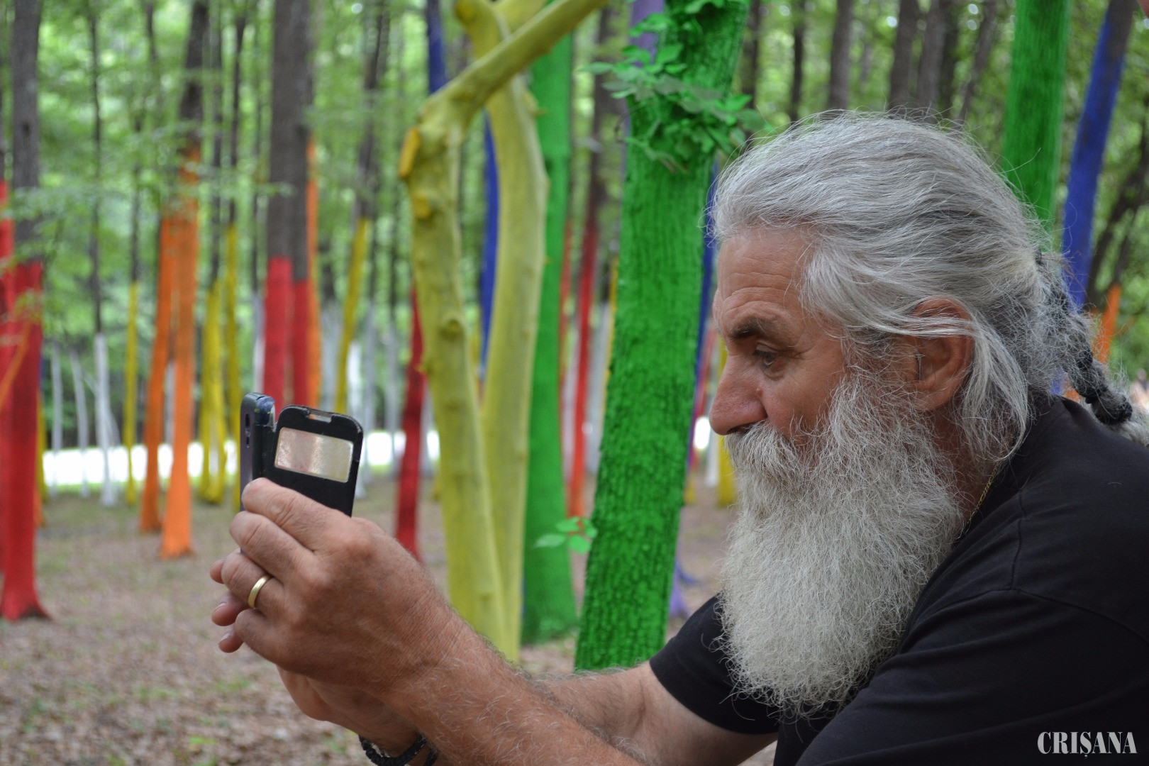 Nici mai mult, nici mai puțin decât spune enunțul: o alcătuire de copaci pe care un artist plastic, Mihai Țopescu, i-a colorat de jos și până sus, până unde a putut ajunge. Cu scări, cu bidinele, cu vopsea care să nu dăuneze copacilor, cu ajutorul altor plasticieni, cu ajutorul voluntarilor, cu ajutorul lui Dumnezeu. De ce? Am mers să vedem și să aflăm – de ce ar colora cineva o pădure?