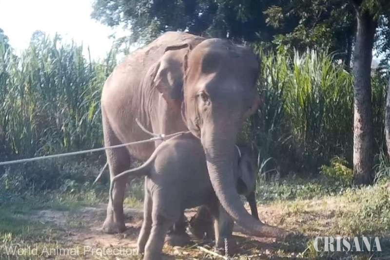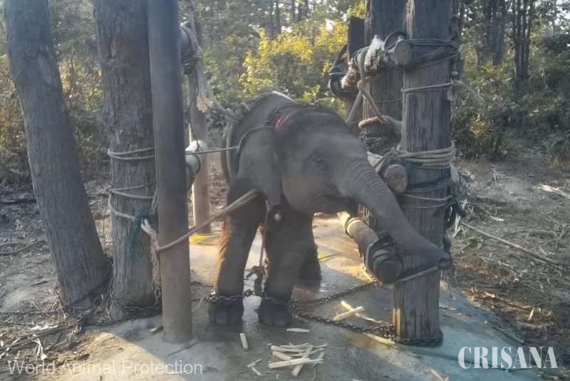Separat de mama sa şi supus unui mare stres, puiul de elefant este închis într-o incintă îngustă şi legat cu lanţuri şi funii, arată imaginile filmate cu camera ascunsă anul trecut în Thailanda şi publicate de grupul britanic pentru protecţia animalelor World Animal Protection (WAP).