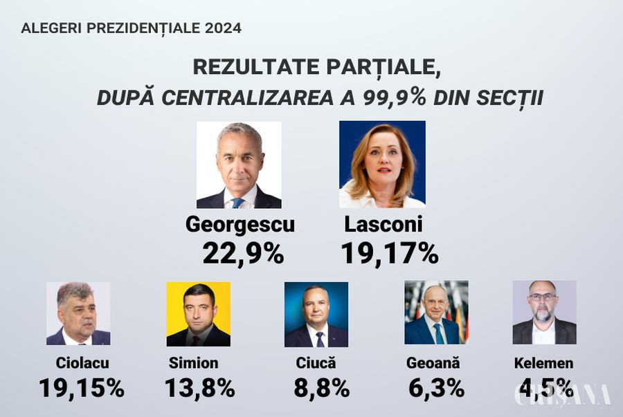 Rezultate oficiale alegeri prezidențiale – Suveranistul Călin Georgescu este pe primul loc, Elena Lasconi intră în turul doi