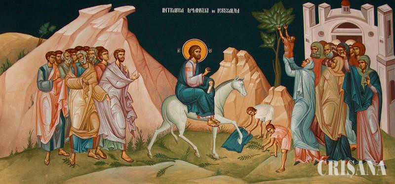 La sărbătoarea Floriilor Îl vedem pe Hristos Domnul mergând blând și liniștit să-și întâmpine „destinul" hărăzit de sfatul Sfintei Treimi în vederea răscumpărării neamului omenesc din robia morții, intrând în Ierusalim ca Împărat al Păcii „pe mânzul asinei", împlinind astfel proorocia lui Zaharia (9,9). Iisus se îndreaptă liniștit spre Ierusalim, unde știe că va fi prins, judecat și condamnat. Știe nestatornicia firii omenești și lașitatea celor care de la „Osana Fiului lui David; binecuvântat este Cel ce vine întru numele Domnului", vor trece curând în tabăra „cetepiștilor" și a „secular-umaniștilor" care vor striga „Ia-L! Ia-L! Răstignește-L!".