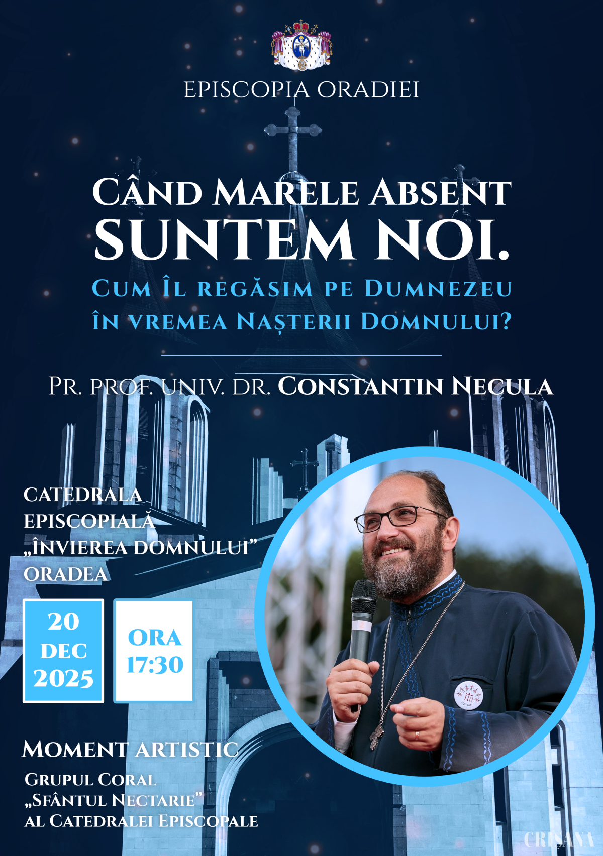 Primul eveniment va avea loc sâmbătă, 20 decembrie, ora 17.30, la Catedrala Episcopală „Învierea Domnului” din Oradea, unde părintele Constantin Necula va susține conferința cu tema „Când Marele Absent suntem noi. Cum Îl regăsim pe Dumnezeu în vremea Nașterii Domnului?”. Întâlnirea de la Oradea va fi prefațată de un moment artistic, un concert de colinde susținut de Grupul coral „Sfântul Nectarie” al Catedralei Episcopale.