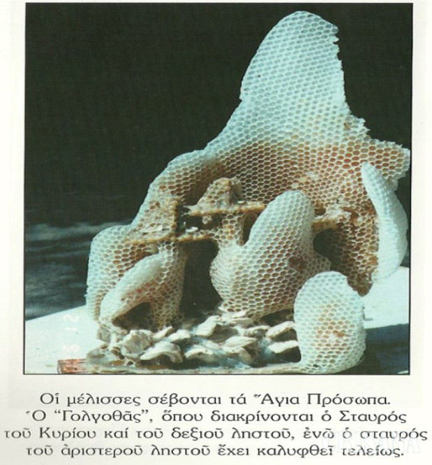 Albinele au învăscut iarăși cu ceară întreaga suprafaţă a piesei puse în stup, dar au lăsat să se vadă crucea Mântuitorului şi cea a tâlharului din dreapta Sa, primul om din lume mântuit de Iisus, în timp ce crucea tâlharului din stânga lui Iisus (tâlharul ce l-a ocărât pe Iisus!) albinele au acoperit-o cu un strat gros de ceară.