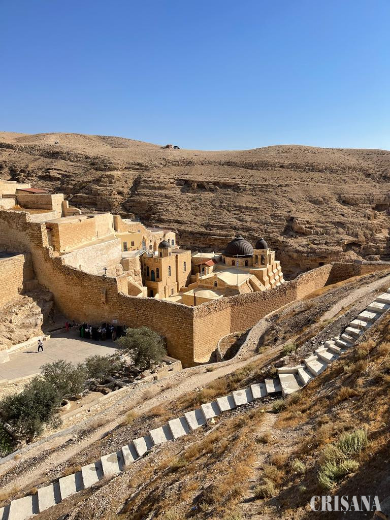 A treia zi, 10 noiembrie 2022. După agapa prietenească a pelerinilor a urmat parcă în chip firesc un episod de postire și nevoință printr-o nouă deplasare spre un alt areal din pustia Iudeii unde străjuiește mânăstirea Sfântului Sava cel Sfințit (în grecește Aghios Sabba). Semnificația pustiei, a deșertului, a locului lipsit cu totul de vegetație este întâlnită pe tot cuprinsul Scripturii. După ce au părăsit Egiptul cel bogat, adăpat din belșug de apele Nilului care întinde peste câmpuri mâlul cel roditor pentru două recolte pe an, vechii iudei au trecut în mod miraculos apele Mării Roșii, dar greutatea drumului abia începea. Poporul ales a fost încercat de Domnul așa cum focul încearcă și purifică aurul și argintul, îndepărtând zgura netrebuincioasă și pentru a străluci în toată puterea. Focul purificator s-a dovedit căldura zilelor și frigul nopților din pustiu, setea și foamea, însingurarea, sentimentul de nesiguranță, idolatria, toate trăite pe viu prin nemărginirea cumplit de pustie a Peninsulei Sinai, mărginită de Golful Suez și Golful Aqaba și separată de Marea cea Mare (Marea Mediterană) de ținutul neprietenos și nisipos al filistenilor și care făcea legătura terestră între Egiptul marilor faraoni și Palestina, prin zone alcătuite din granit tare, gresie și alte roci dure, pentru că pe două din aceste roci dure din Munții Sinaiului se va fi scris cele zece porunci ale lui Dumnezeu și ale umanității întregi. Când iudeii au părăsit Egiptul, se crede ca au fost în număr de circa 600.000 de bărbați în afară de familiile lor, astfel că numărul total al imigranților biblici ar fi ajuns în jur de 2 milioane de suflete. Ei nu au mărșăluit în coloane lungi de câte patru, cum s-ar crede, de-a lungul și de-a latul Peninsulei Sinai, ci se stabileau în văi mici și grupați pe familii și seminții, ajutându-se între ei cu rezervele de apă. Perioada eroică a Exodului și a drumului prin deșert a însemnat din punct de vedere teologic un simbol, un destin, o călăuzire divină, o împlinire a unui vis, un simbol al providenței divine, dar și al naturii răzvrătite a omului, întruchipate de episoadele de cârtire, de recădere în idolatrie, de lăcomie, de răscoală împotriva lui Moise, a fost un drum al calvarului, de căutare înfrigurată a unui liman, a țării promise de Dumnezeu. Morala ar fi aceea că nu poți ajunge în țara unde curge lapte și miere, fără imense sacrificii, nu poți atinge cerul divin fără a fi mai întâi cufundat în râpele dezgustătoare ale iadului de pe pământ. Cum ne-am făcut ucenicia cu drumul din pustia Hozevei, suntem acum obișnuiți să vedem și alte locuri pustii, neprietenoase, printre care se înalță doar colții ascuțiți ai stâncilor de tot felul. Am ajuns cu autocarul condus de arabul Hameed pe un tăpșan înalt de unde ne îmbarcăm imediat în mai multe microbuze conduse de șoferi pricepuți să ne ducă în jos spre o vale adâncă, valea Chedron (care coboară de la Ierusalim și se varsă în Marea Moartă) pe niște drumuri înguste, periculoase, abrupte și aflate pe buza prăpăstiilor până în apropiere de Mânăsirea Sfântului Sava cel Sfințit. Intrăm în mânăstire printr-o ușă foarte îngustă și joasă, încât ne aplecăm capetele, iar femeile rămân afară, nu li se permite accesul, întocmai regulilor care se întâlnesc și pe cuprinsul Sfântului Munte Athos și Mânăstirii Frăsinei de la noi. Femeile pot să vadă mânăstirea de sus, din Turnul femeilor care este situat pe partea înaltă a colinei din dreapta mânăstirii și unde a stat odinioară însăși mama Sfântului Sava, neputând să-l vadă pe fiul ei, pentru a nu se încălca regula monahală strict statornicită.