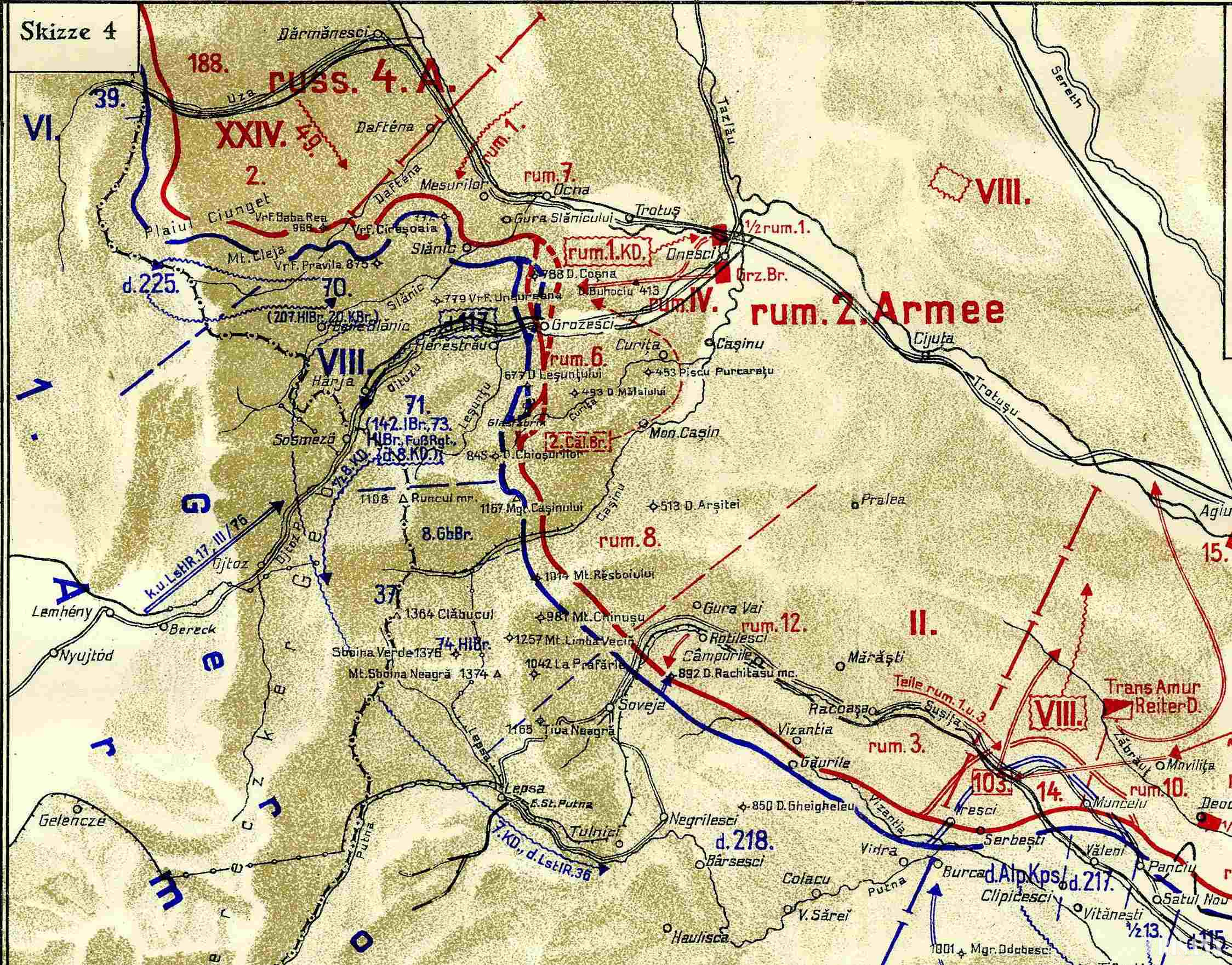 La două zile după ce Armata IX-a germană ataca la Mărăşeşti, aripa stângă a armatei germano-austro-ungare comandată de generalul Friedrich von Gerok (Grupul Gerok) a lansat ofensiva de la Oituz pe direcţia est, spre valea Trotuşului. Obiectivul era de a învălui şi a strânge în cleşte Armata a II-a condusă de generalul Alexandru Averescu, care pătrunsese în depresiunea Soveja. În aceleaşi timp, Armata a IX-a şi Armata a VII-a austriacă ataca în Bucovina, iar comandamentul de război austro-ungar spera ca ofensiva Gerok să continue dincolo de Trotuş. Împreună cu ofensiva de la Mărăşeşti, toate aceste atacuri urmăreau strivirea armatei române şi ocuparea Moldovei. „În caz contrar”, era de părere arhiducele Josef, „România va renaşte şi ne va da bătăi de cap.”