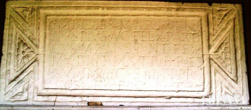 "Împaratul Caesar, Marcus Aurelius Antoninus, cel pios, Augustus, cel fericit, mare învingător al parților, mare preot, mare învingător al britannilor, investit cu puterea tribuniciană pentru a 16-a oară, aclamat imperator (învingător) de două ori, consul de patru ori, părinte al patriei, proconsul, a făcut (aceasta)."