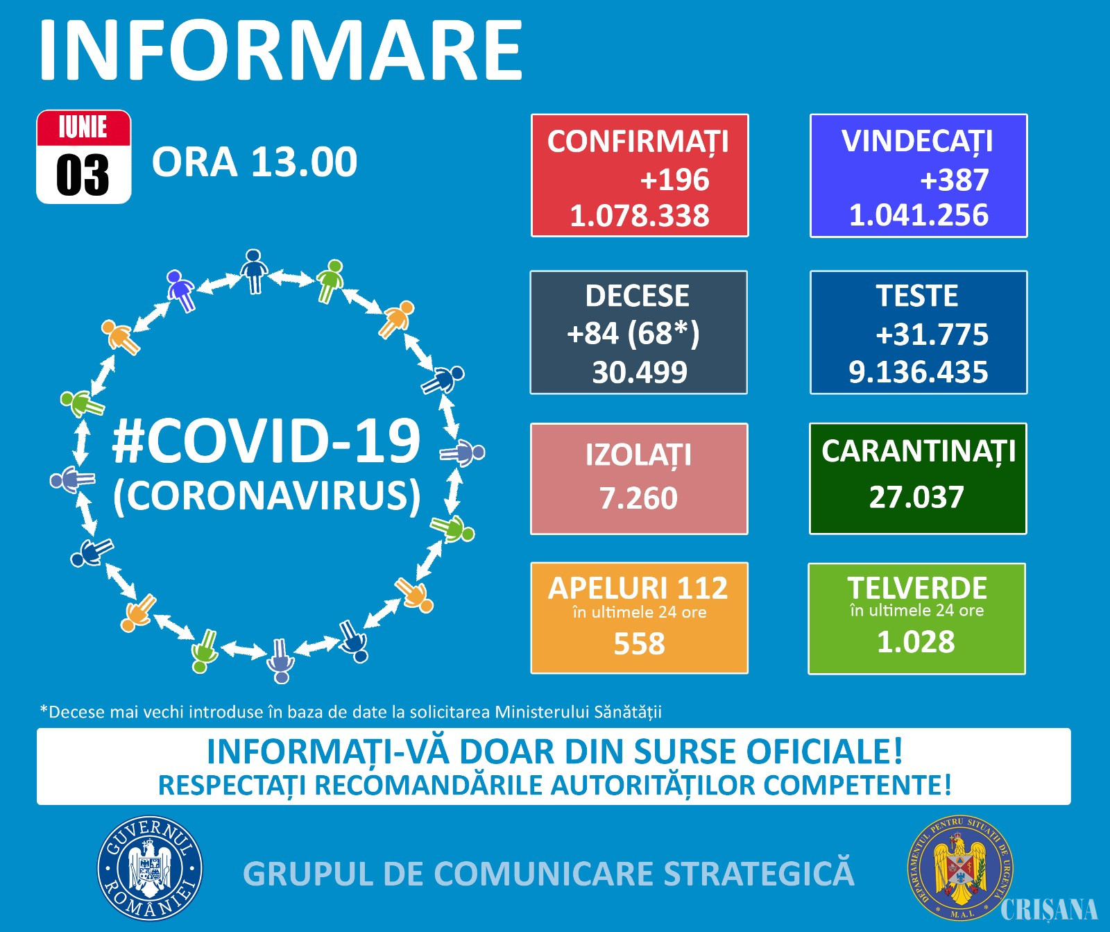 La nivel național, din 9.136.435 teste efectuate, numărul persoanelor infectate a ajuns la 1.078.338. În ultimele 24 de ore au fost efectuate 31.775 teste, identificându-se 196 cazuri noi, care nu au mai avut anterior un test pozitiv. Distinct de cazurile nou confirmate, în urma retestării pacienților, 69 persoane au fost reconfirmate pozitiv.