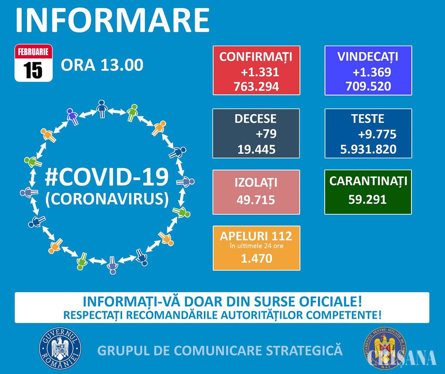 În spitale, numărul total de persoane internate cu Covid-19 era, luni, de 7.048, dintre care 941 la ATI. Pe teritoriul țării, 39.646 persoane erau confirmate cu infecție cu noul coronavirus și erau în izolare la domiciliu, iar 10.069 se aflau în izolare instituționalizată. De asemenea, 59.158 persoane se află în carantină la domiciliu, iar în carantină instituționalizată se află 133 persoane. Până lunii, 15 februarie, 19.445 persoane diagnosticate cu Covid-19 au murit, 79 de decese fiind înregistrate în ultimele 24 de ore.
