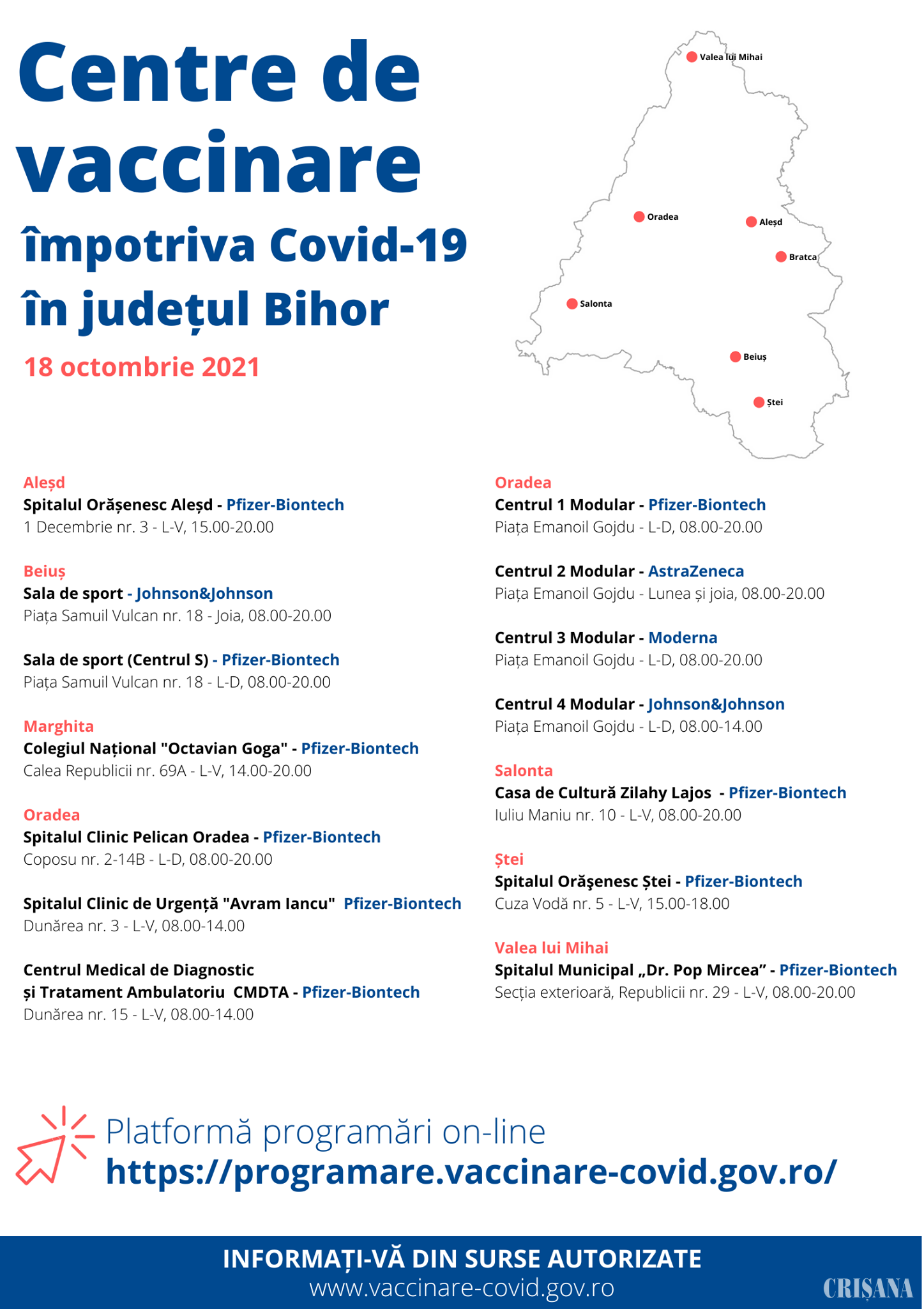 S-au vaccinat 1.114 persoane (152.087 cu ambele doze și 15.397 cu doza a treia) și sunt înregistrate 72 de reacții adverse. Incidența în Oradea a depășit 9,5 cazuri la 1.000 de locuitori (9,69), iar incidența la nivelul județului a depășit 7 cazuri la 1.000 de locuitori (mai exact 7,01). 33 localități din Bihor sunt în scenariul roșu, cu o incidență mai mare de 7 cazuri la 1.000 de locuitori. Cea mai ridicată rată de infectare este în Spinuș - 14,9, urmată de Ceica - 13,18 și Toboliu - 13,08.