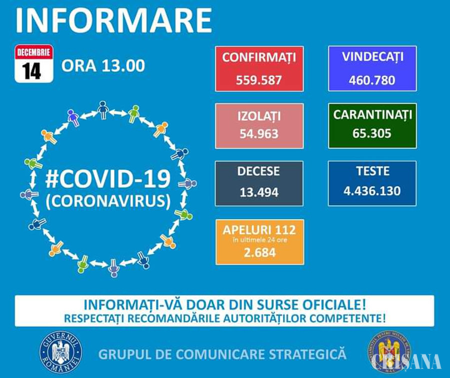 Coeficientul infectărilor cumulat la 14 zile, raportat la 1.000 de locuitori, calculat de către Direcțiile de Sănătate Publică ale județelor pentru ziua de luni, 14 decembrie, este următorul: București – 6,9, Constanța și Ilfov – 6,49, Cluj – 4,91, Brașov – 4,71, Timiș - 3,97, Argeș - 3,89, Arad – 3,46, Galați – 3,33, Sibiu – 3,2, Ialomița și Tulcea – 3, 16, Bihor – 3,13.