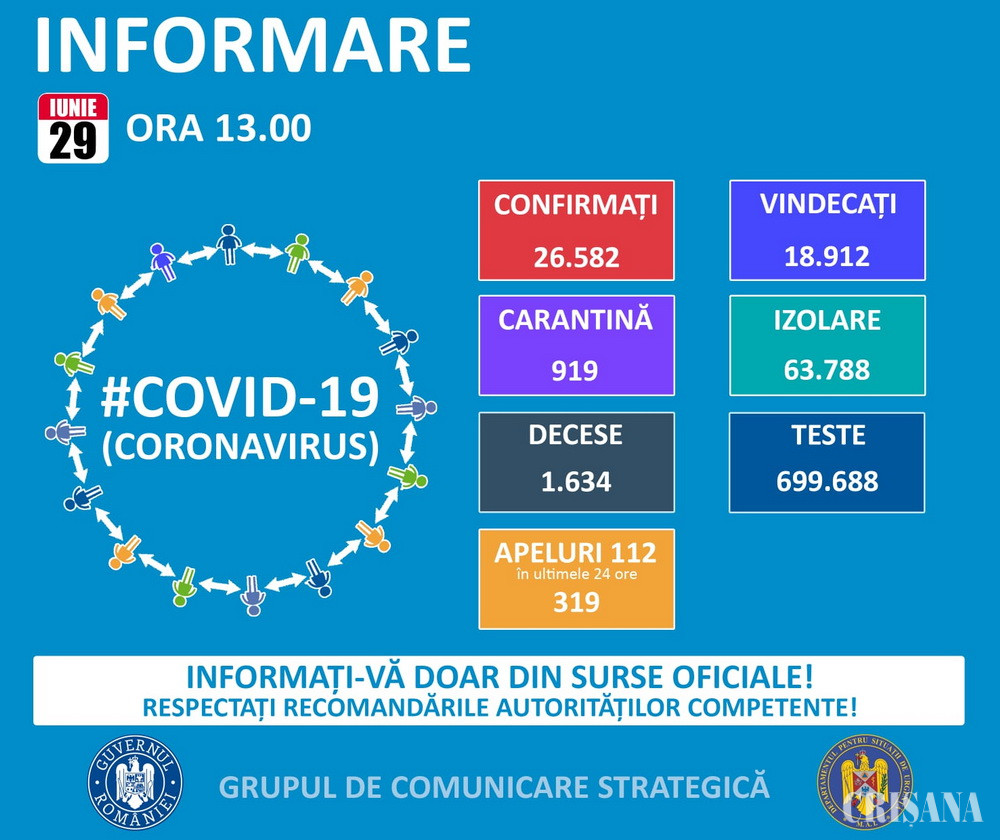 La nivel național, din 699.688 de teste prelucrate, numărul persoanelor infectate a ajuns la 26.582, cu 18.912 de persoane declarate vindecate și externate. Față de duminică, luni s-au identificat 269 cazuri noi de îmbolnăvire (o scădere cu 22 de cazuri față de cele identificate duminică).