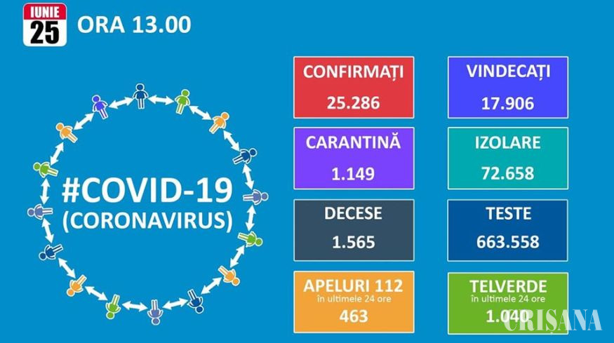 La nivel național, din 663.558 de teste prelucrate, numărul persoanelor infectate a ajuns la 25.286, cu 17.906 de persoane declarate vindecate și externate. Față de miercuri, joi s-au identificat 460 de cazuri noi de îmbolnăvire (o creștere cu 139 de cazuri față de cele identificate miercuri).