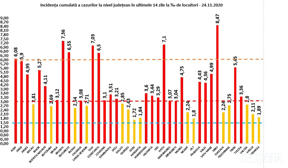 Coeficientul infectărilor cumulate la 14 zile, raportate la 1.000 de locuitori, calculat de către Direcțiile de Sănătate Publică ale județelor pentru ziua de marți, 24 noiembrie, este următorul: Sibiu – 8.47, Brașov – 7.36, Ilfov – 7.1, Cluj – 7.03, București – 6.55, Constanța – 6.5, Alba – 6.08, Arad – 5.9, Timiș – 5.45, Bihor – 5.27 (o scădere cu 0.10 față de luni)