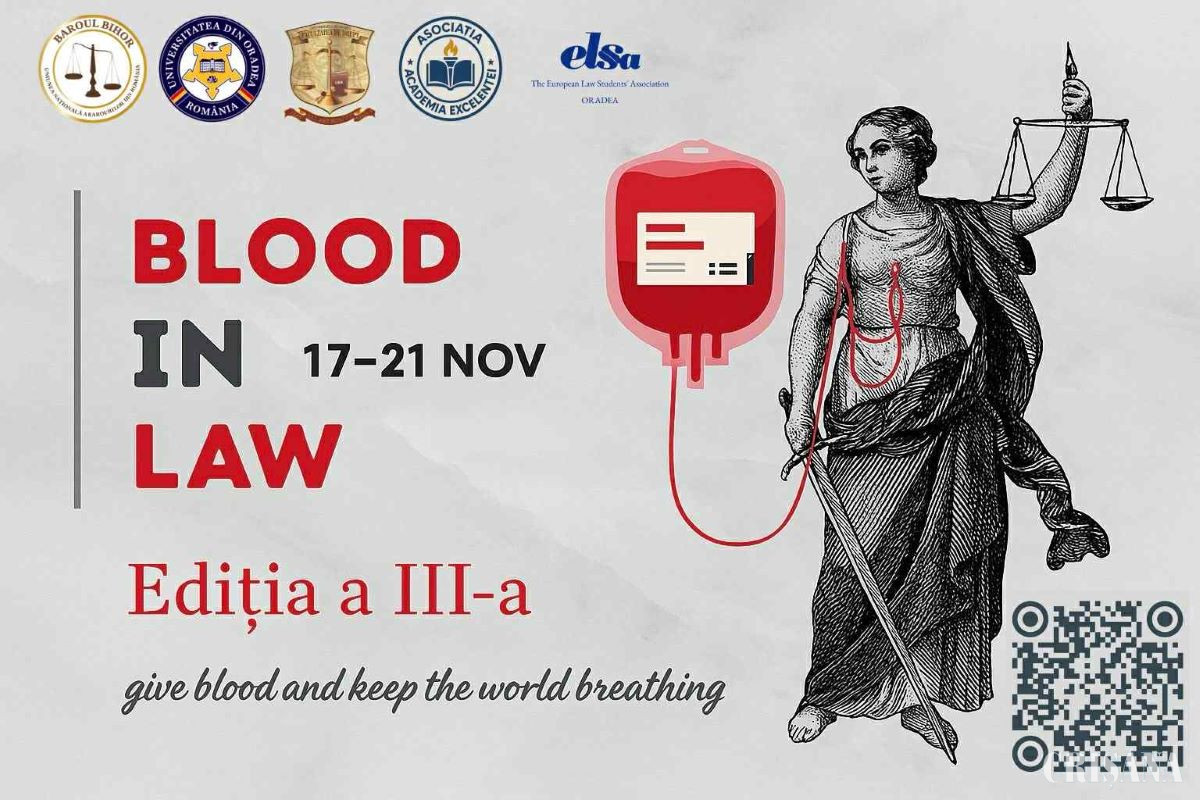 Campania de donare de sânge „Blood (in) Law(s)”, ajunsă la cea de-a treia ediție, se va desfăşura între 17 și 21 noiembrie la Centrul de Transfuzie Sanguină Oradea, aducând din nou împreună comunitatea juridică, universitară și locală într-un demers al empatiei și responsabilității.