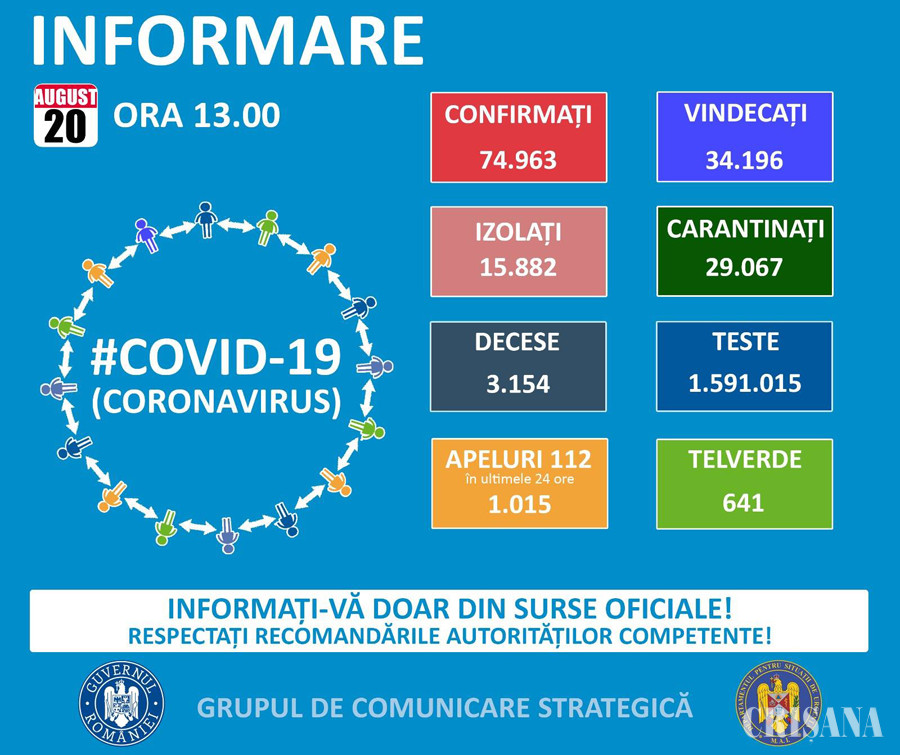 Grupul de Comunicare Strategică a anunţat, ieri, că încă 85 de bihoreni au fost depistaţi cu Covid – 19 în 24 de ore, în judeţul nostru înregistrându-se şi decese. Detalii despre persoanele care şi-au pierdut viaţa nu au fost însă oferite de către autorităţi, potrivit unor surse fiind vorba despre doi bărbaţi, unul în vârstă de 46 de ani şi celălalt de 81 de ani. În ceea ce îi priveşte pe cei depistaţi pozitiv de miercuri până joi, printre aceştia se numără cadre medicale de la UPU-SMURD, pacienţi internaţi în Spitalul Judeţean, dar şi personal de la Spitalul Militar şi cel Judeţean din Oradea. La nivel naţional, în 24 de ore au fost diagnosticate 1.346 de cazuri noi de Covid-19, iar 48 de români au murit, potrivit raportului de joi al Grupului de Comunicare Strategică (GCS). Potrivit GCS, până joi, pe teritoriul României, au fost confirmate 74.963 de cazuri de persoane infectate cu noul coronavirus. 34.196 pacienți au fost declarați vindecați și 8.820 pacienți asimptomatici au fost externați la 10 zile după depistare. De miercuri, de la ora 10.00, până joi, la ora 10.00, au fost înregistrate 48 de decese, dintre care 31 bărbați și 17 femei. Este vorba de pacienți infectați cu noul coronavirus, internați în spitalele din Argeș, Bacău, Bihor, Botoșani, Brăila, Brașov, Buzău, Caraș – Severin, Cluj, Dâmbovița, Dolj, Galați, Gorj, Maramureș, Mehedinți, Mureș, Neamț, Olt, Prahova, Sălaj, Suceava, Tulcea, Vaslui, Municipiul București. Dintre acestea, patru decese au fost înregistrate la categoria de vârstă 40-49 ani, șapte la categoria 50-59 ani, 15 decese la categoria de vârstă 60-69 ani, 11 decese la categoria de vârstă 70-79 ani și 11 decese la categoria de peste 80 de ani. 46 dintre decesele înregistrate sunt ale unor pacienți care au prezentat comorbidități, iar doi pacienți decedați nu au prezentat comorbidități.