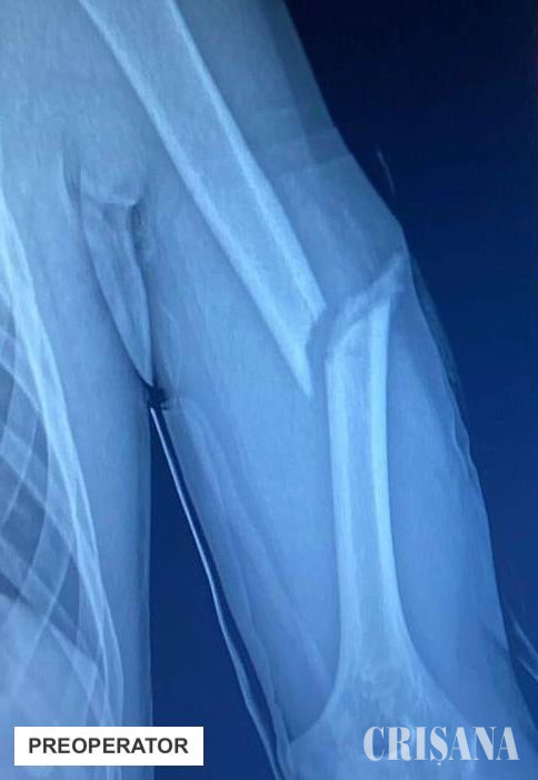 Un pacient în vârstă de 16 ani s-a prezentat la Spitalul Clinic Județean de Urgență Bihor cu o fractură diafiză humerală cu deplasare, în urma unui accident rutier. Osul lung al brațului (humerusul) era fracturat, iar cele două segmente erau deplasate de la locul lor. Adolescentul trebuia operat pentru repunerea la loc a fragmentelor osoase fracturate, soluțiile clasice pentru tratamentul ortopedic al fracturilor pediatrice implicând fie montarea unei plăci cu șuruburi, sau utilizarea tijelor elastice. În acest caz însă, din cauza vârstei de peste 15 ani, pacientul avea cartilajul de creștere închis, ceea ce reprezintă un factor de incompatibilitate cu variantele chirurgicale menționate.