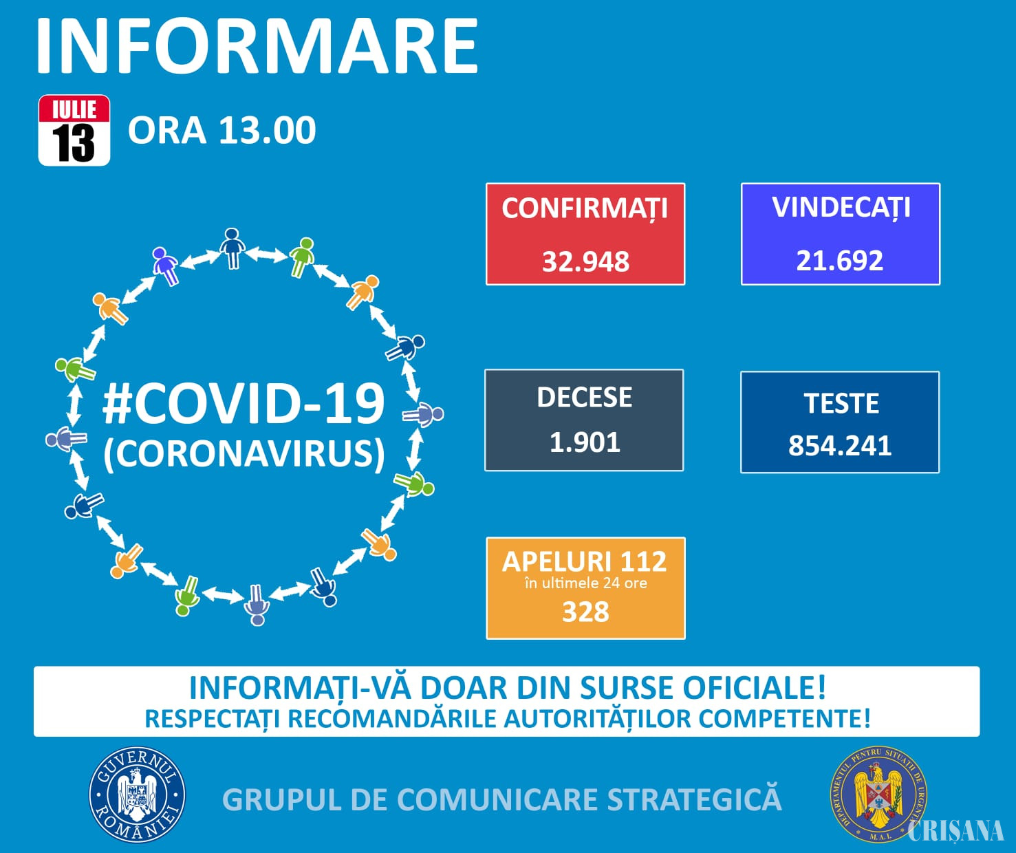 Potrivit informării Grupului de Comunicare Strategică, duminică, în judeţul nostru erau înregistrate 708 persoane confirmate pozitiv de la începutul pandemiei, ieri numărul acestora ajungând la 711. La nivel naţional s-au înregistrat 413 noi cazuri de îmbolnăvire cu coronavirus și 17 decese. Până luni, în România au fost confirmate 32.948 de cazuri de persoane infectate cu noul coronavirus. Dintre persoanele confirmate pozitiv, 23.552 au fost externate, dintre care 21.692 de pacienți vindecați și 1.860 de pacienți asimptomatici, externați la 10 zile după depistare. Totodată, până în prezent, 573 de pacienți cu test pozitiv au fost externați la cerere. Tot până luni, 1.901 persoane diagnosticate cu infecție cu Covid-19 au murit.