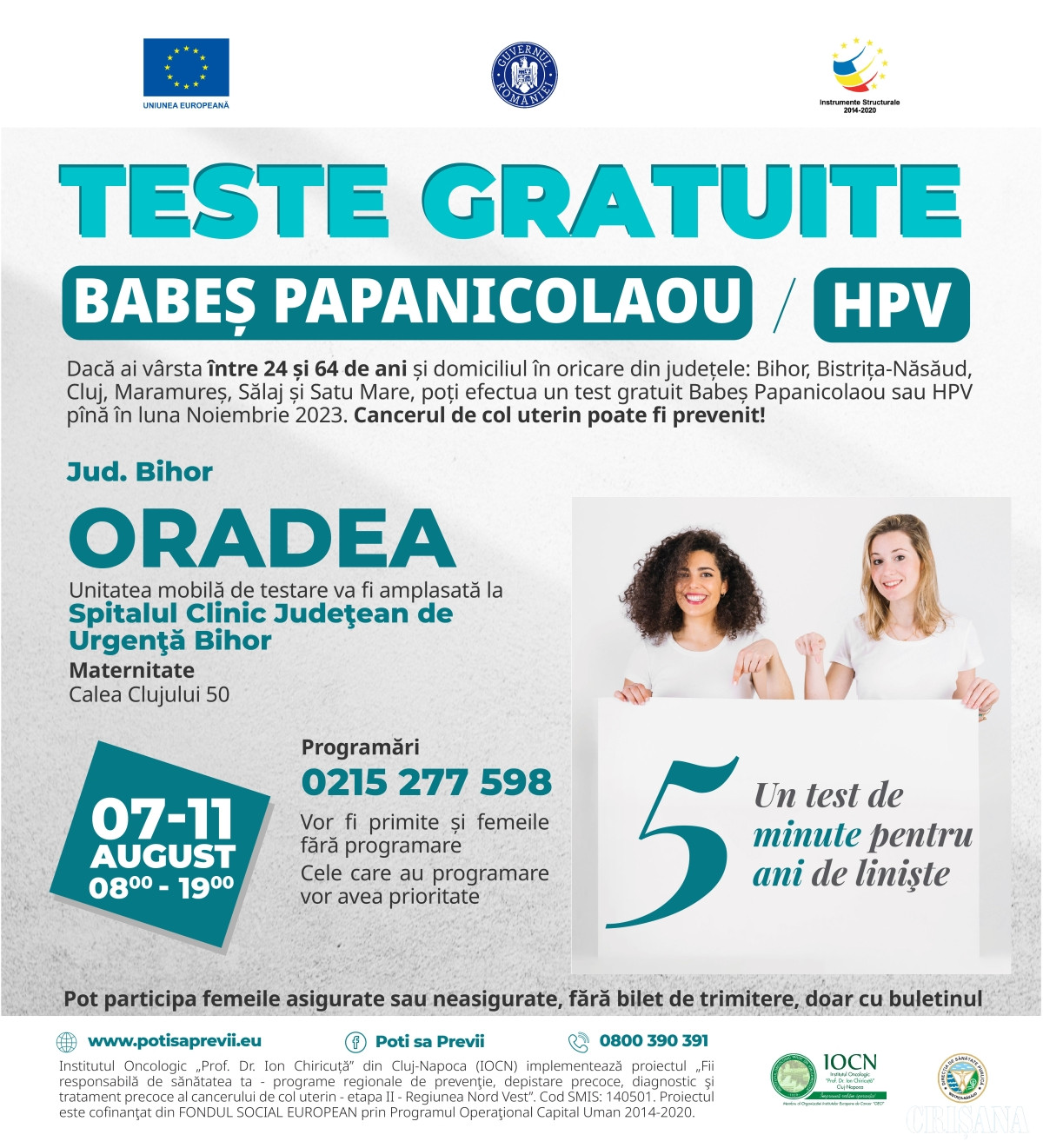 Pentru programări sunați la numărul de telefon 0215 277 598. Vor fi testate și femeile care nu au programare. Cele cu programare vor avea prioritate.