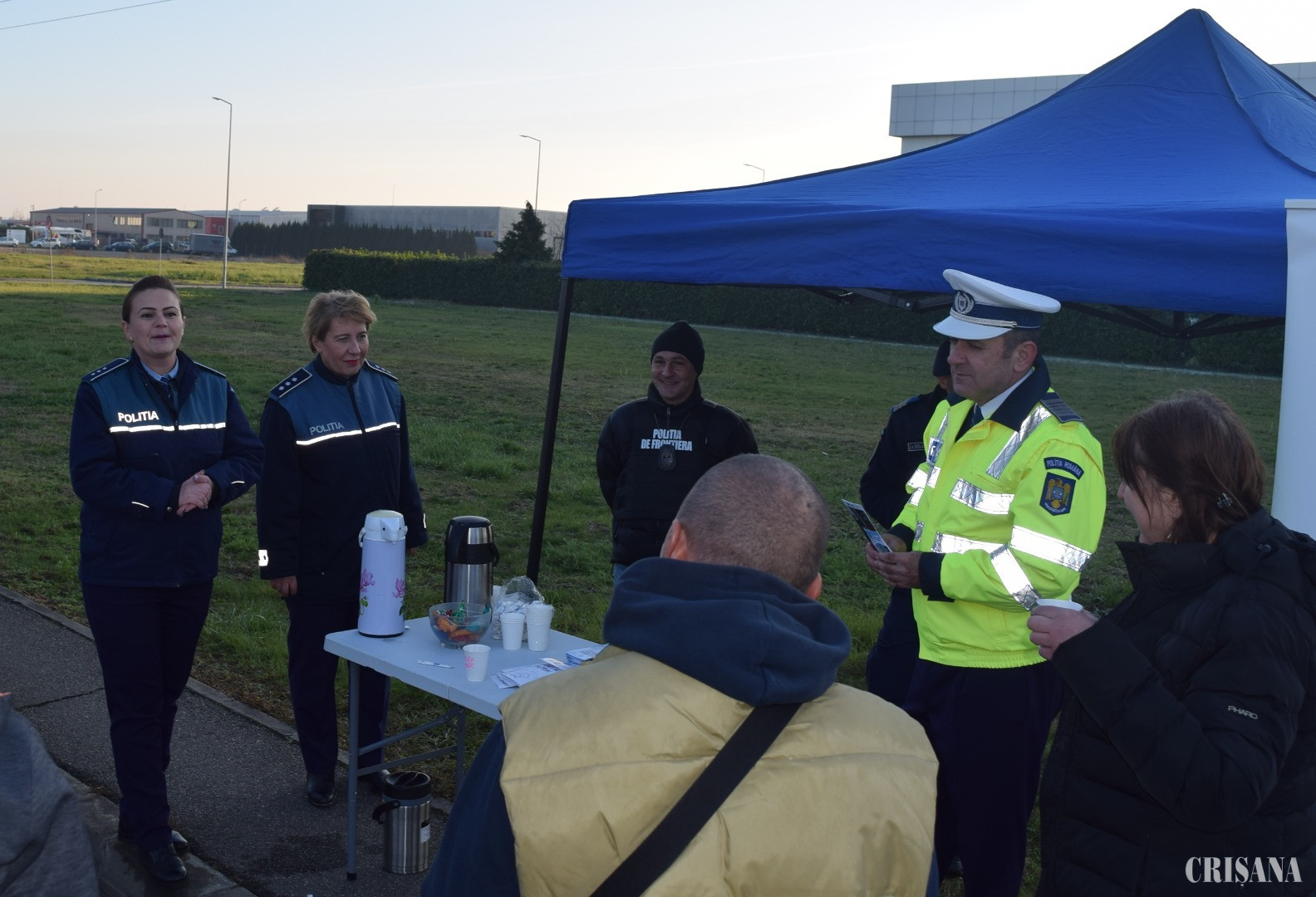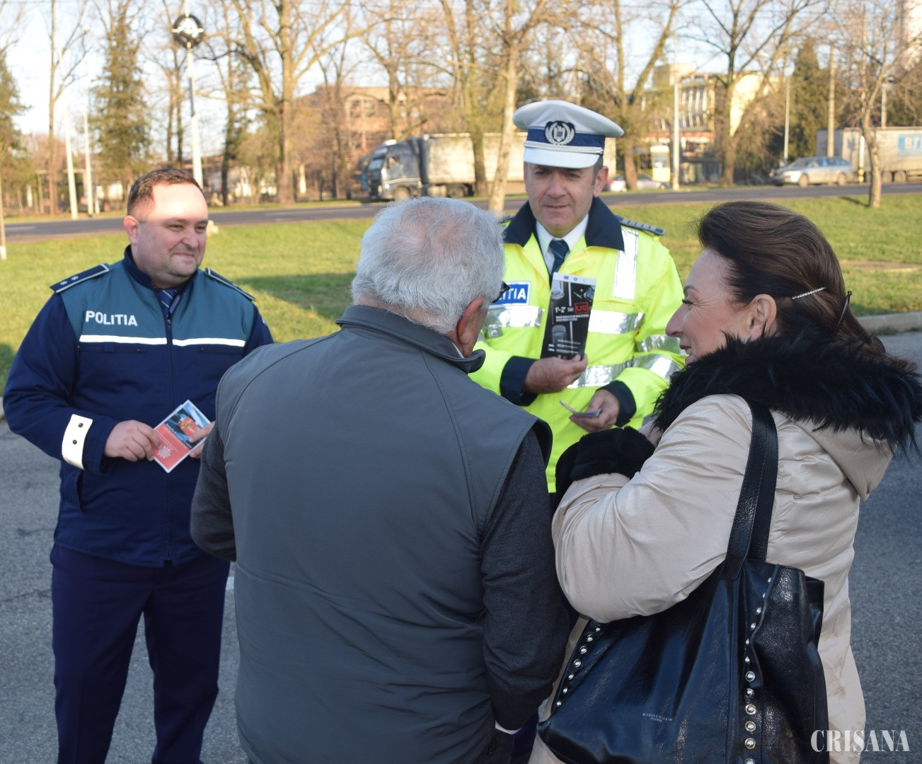 Polițiștii Compartimentului de Analiză și Prevenire a Criminalității împreună cu polițiștii Serviciului Rutier, alături de polițiști de frontieră și de jandarmi, au derulat o nouă acțiune preventivă în trafic, pentru a preveni victimizarea cetățenilor prin accidente rutiere produse pe fondul oboselii la volan și pentru prevenirea victimizării prin diferite tipuri de infracțiuni specifice perioadei sărbătorilor de iarnă. Astfel, polițiștii rutieri au oprit în trafic, luni şi marţi, autoturismele care au intrat în țară dinspre PTF Borș, pe Șoseaua Borșului, înainte de intrarea în municipiul Oradea și i-au servit pe conducătorii auto și pe pasagerii acestora cu ceai cald și cu cafea, din pahare inscripționate cu mesaje preventive, oferindu-le, astfel, prilejul de a se revigora, înainte de a-și continua călătoria. De asemenea, copiii au fost întâmpinați de polițiști cu dulciuri și moșuleți din ciocolată. Totodată, polițiștii de prevenire au discutat cu conducătorii auto și cu pasagerii autovehiculelor oprite despre măsurile de siguranță pe care trebuie să le aibă în vedere atunci când pornesc la drum, pentru a preveni furturile din locuințe, din autoturisme, înșelăciunile, le-au transmis să își protejeze bunurile personale, să nu le lase nesupravegheate în autoturisme, să aibă grijă la cunoștințele ocazionale, pentru a nu fi victimizați, dar și despre regimul utilizării obiectelor pirotehnice și despre riscurile la care se expun dacă nu respectă prevederile legale.