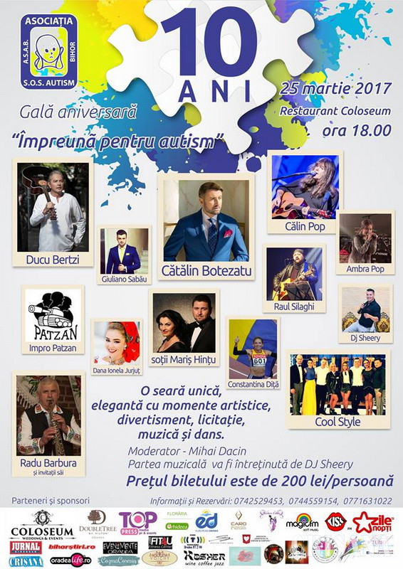 Asociaţia S.O.S.Autism Bihor aniversează, în luna martie, zece ani de la înfiinţare și, cu această ocazie, organizează în data de 25 martie, începând cu ora 18.00, la restaurant Coloseum, Gala aniversară ,,Împreună pentru autism”.