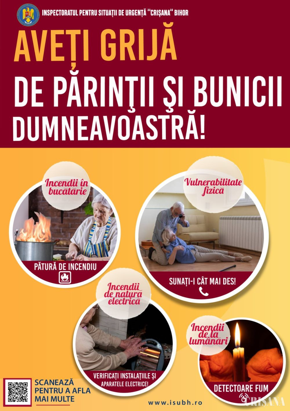 În după-amiaza zilei de joi, echipajele specializate ale Inspectoratului pentru Situații de Urgență “Crișana” al județului Bihor au fost solicitate să intervină pentru salvarea unei septuagenare aflate într-o situație de urgență, în propria locuință, situată la etajul 1 al unui bloc de pe strada Dunării din municipiul Oradea. Două echipaje de pompieri militari, din care unul de paramedici, din cadrul Detaşamentului 2 Oradea s-au deplasat cu operativitate la adresa menționată, unde, utilizând scara culisabilă, au pătruns în apartament prin fereastra camerei de zi, găsind-o pe proprietară căzută în dormitor, lângă pat, în stare de conştienţă, dar în imposibilitatea de a se mişca, din cauza unor probleme de sănătate. Pompierii militari paramedici i-au acordat primul ajutor calificat septuagenarei, aceasta rămânând ulterior la domiciliu, în urma refuzului de a fi transportată la spital. Pompierii militari bihoreni continuă să desfășoare la nivelul întregului județ, campania “Aveți grijă de părinții și bunicii dumneavoastră!”, trăgând un semnal de alarmă asupra vulnerabilității vârstnicilor în fața diferitelor riscuri la care sunt expuși și recomandând totodată, măsurile și modul adecvat prin care aceste riscuri pot fi reduse sau înlăturate. Campania se adresează în primul rând, rudelor și îngrijitorilor persoanelor vârstnice, cărora le sunt recomandate o serie de măsuri menite a-i proteja pe cei dragi, dar, în același timp, și persoanelor cu vârste de peste 60 de ani, cărora le oferim soluții la îndemână pentru prevenirea accidentelor casnice și a incendiilor.