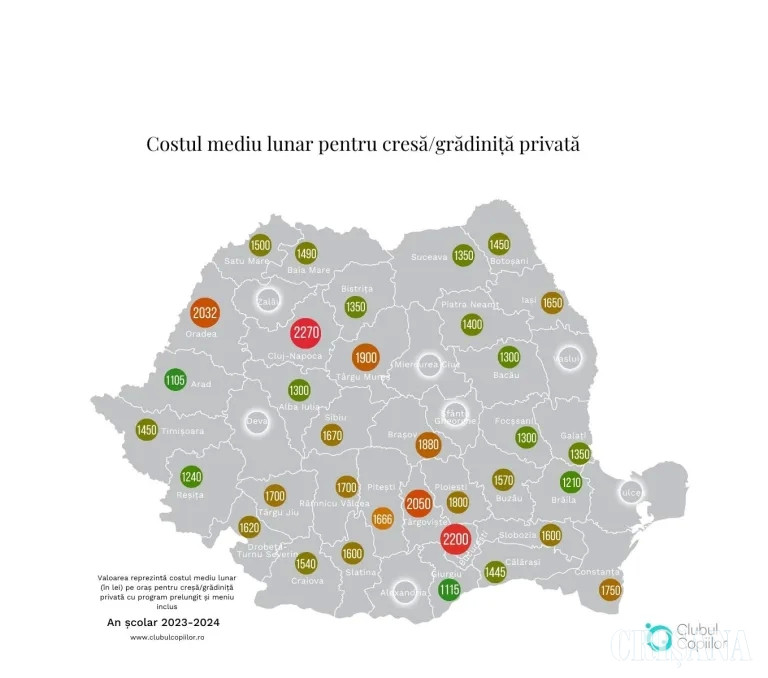 Prețul mediu cel mai mare este în orașul Cluj-Napoca, unde taxă lunară medie este de 2.270 lei, urmat imediat de Capitală, unde prețul mediu lunar este de 2.200 lei. De precizat că cea mai scumpă creșă/grădiniță din cele analizate de Clubul Copiilor nu se află în orașul de sub Feleac, ci în capitală.