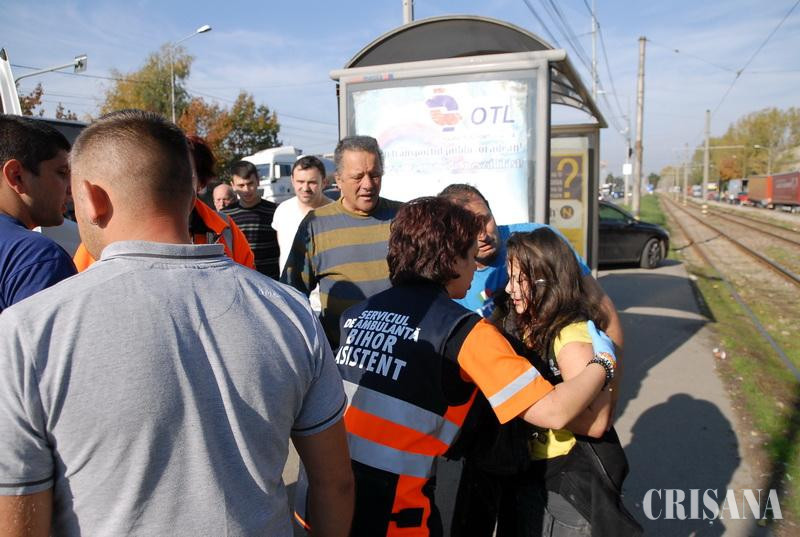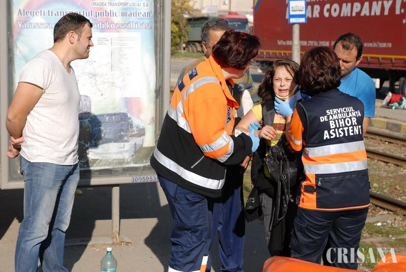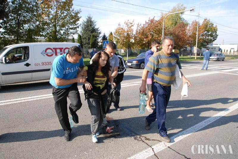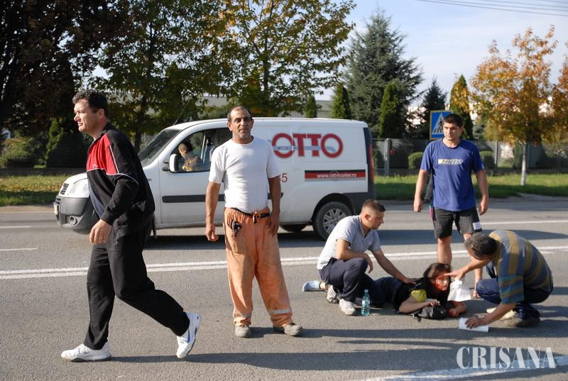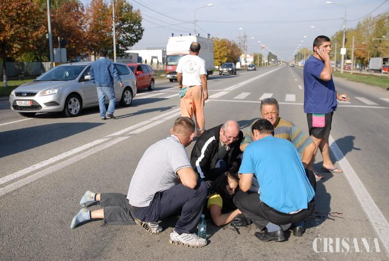 Înainte ca Poliţia şi Ambulanţa să ajungă la faţa locului, femeia a fost ajutată de câţiva bărbaţi care au oprit maşinile în apropiere. Întinsă pe burtă, femeia avea capul şi părul năclăite de sânge, dar era lucidă, întrebând repetat: "Cum am ajuns eu aici!". Bărbaţii care s-au adunat în jurul ei au adus apă în bidoane şi au început să îi spele părul şi braţele de sângele care continua să curgă. Unii dintre ei strigau la ceilalţi să nu încerce să o mute din loc, deşi tirurile aflate în drum spre Vamă se opriseră la câţiva metri, unele reuşind cu greu să ocolească locul. Doi bărbaţi au luat triunghiuri fluorescente şi le-au aşezat la câţiva metri în faţa şi în spatele locului în care a avut loc accidentul. Pentru că au văzut că este lucidă şi că îşi poate mişca braţele şi picioarele, doi bărbaţi au reuşit să o ridice şi să o ducă la marginea şoselei. Deşi vizibil şocată, femeia a reuşit să meragă tot drumul pe picioarele ei. A fost momentul în care a ajuns şi Ambulanţa. Victima a fost luată pe targă, fiindu-i pusă o proteză pentru imobilizarea gâtului. "Victima are 27 de ani şi din primele constatări se pare că a fost acroşată pe pietonal de o autoutilitară înmatriculată în Bucureşti, condusă de un şofer de 30 de ani. Cercetările continuă pentru stabilirea împrejurărilor în care s-a produs accidentul", a spus, pentru Crişana, Alina Dinu, purtătorul de cuvânt al Inspectoratului Judeţean de Poliţie Bihor. Conform medicilor, victima se află în afara oricărui pericol, dar are mai multe leziuni la spate.