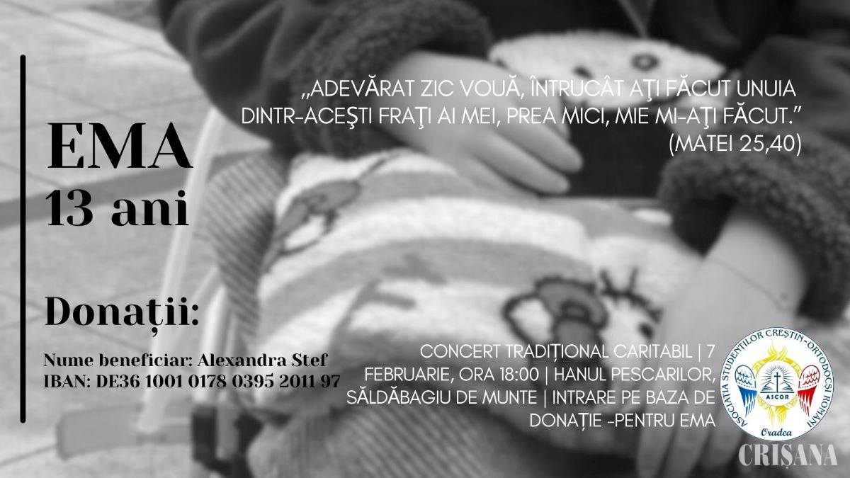 „Am aflat despre acest caz de la o colegă, studentă. Micuța Ema suferă de o formă atât de rară de cancer încât nu există niciun fel de tratament pentru această boală. Ea este crescută numai de mama ei care, fiindcă trebuie să se ocupe în permanență de copilul bolnav, nu poate lucra și nu are nicio altă sursă de venit. Ne dorim foarte mult să le putem ajuta și, din acest motiv, îi invităm pe orădeni să ia parte într-un număr cât mai mare la acest eveniment caritabil”, a declarat Mihai Alec, vicepreședintele ASCOR, student al Facultății de Teologie Ortodoxă „Episcop Dr. Vasile Coman” a Universității din Oradea. La evenimentul caritabil, care va avea loc în 7 februarie, de la ora 18.00, la Hanul Pescarilor din Săldăbagiu de Munte, vor cânta Violeta Gherman și formația ei. Accesul este liber – pe bază de donație – fiind condiționat și de un dressing code; ie sau costum popular. Alături de muzică și dansuri populare, oaspeții vor fi tratați și cu platouri pregătite de gazdele evenimentului. Pentru cei care vor să contribuie la alinarea suferințelor Emei, există și un cont bancar. Beneficiar Alexandra Ștef IBAN: DE36 1001 0178 0359 2011 97.