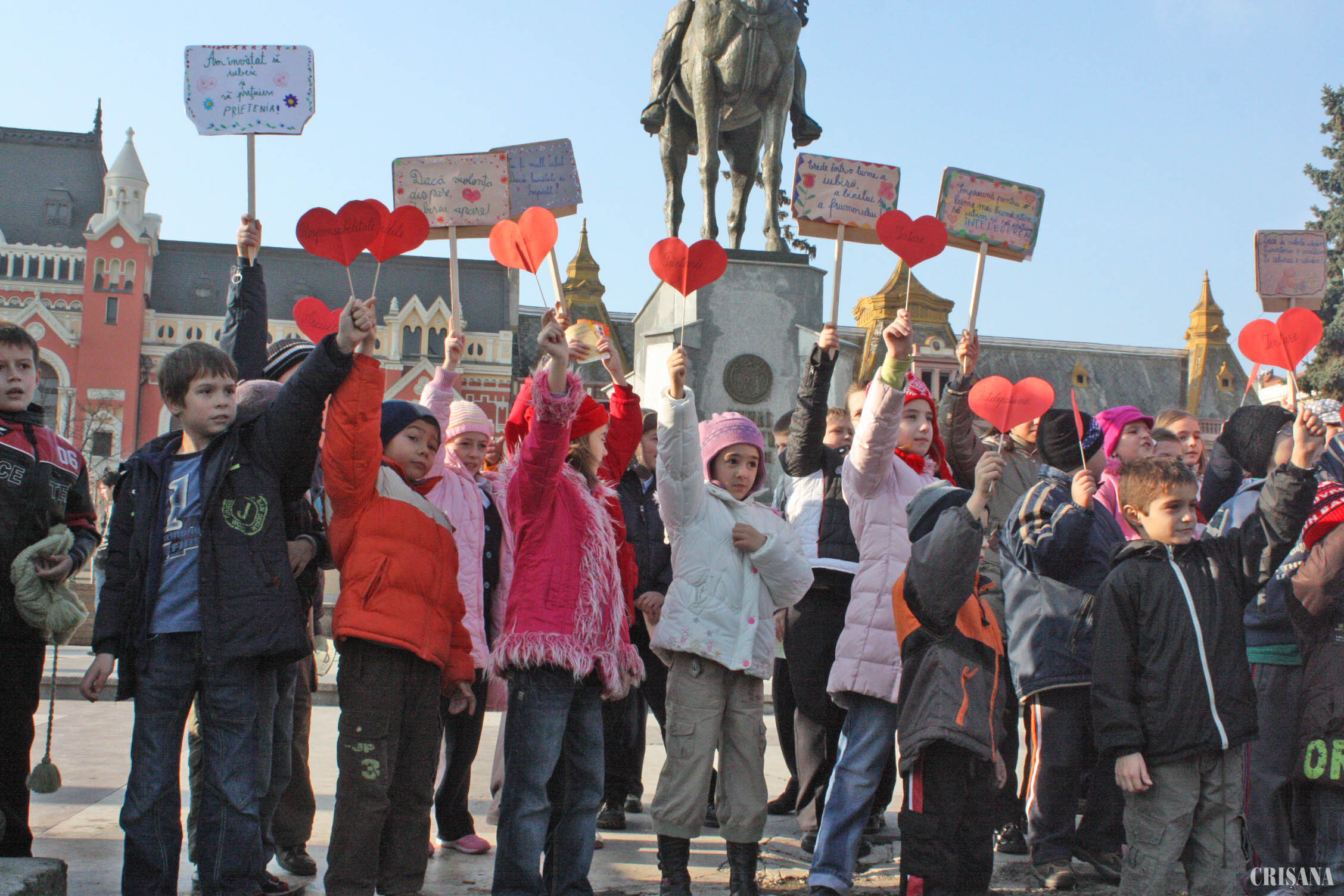 Tot ieri, lângă statuia lui Mihai Viteazul, elevii din clasa a IV-a A de la Liceul Greco-Catolic din Oradea, conduşi de înv. Mariana Lucaci şi înv. Lia Şipoş, respectiv elevii din clasa a II-a A de la Liceului Teoretic German "Friedrich Schiller", conduşi de înv. Emilia Huza, prof. de sprijin Violeta Bobotan şi prof. de desen Anca Moţ, au distribuit trecătorilor pliante şi fluturaşi cu mesaje sugestive, printre care: "Fă un pas spre toleranţă", "Spune NU agresivităţii", "Ascultă ce-ţi spun, apoi iubeşte-mă!", şi au expus un banner inscripţionat cu un mesaj împotriva violenţei domestice.