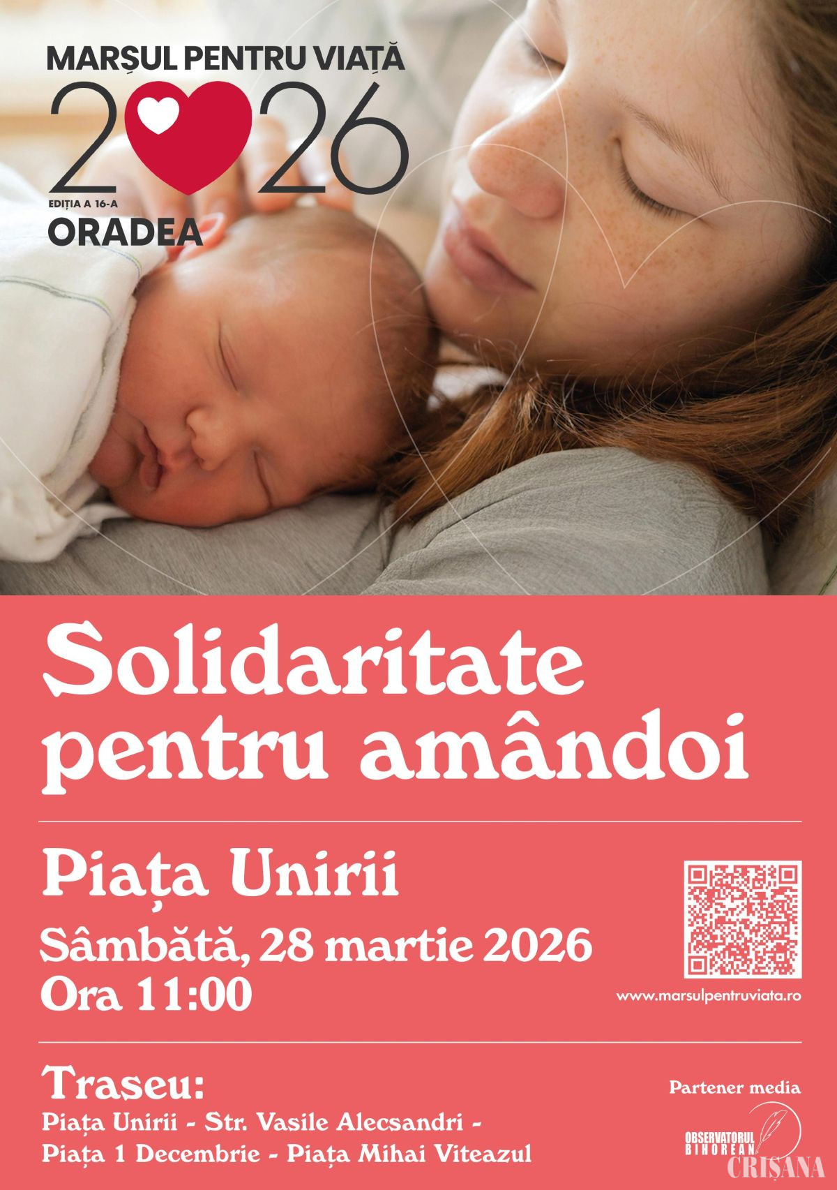 Episcopia Română Unită cu Roma, Greco-Catolică, de Oradea, invită credincioșii și pe toți oamenii de bunăvoință să participe la Marșul pentru Viață 2026, care va avea loc sâmbătă, 28 martie, începând cu ora 11.00, în Piața Unirii din Oradea.