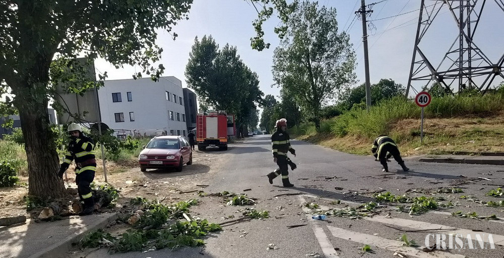 Echipajele Detașamentelor de Pompieri 1 și 2 Oradea, Secției de Pompieri Beiuș, Gărzii de Pompieri Tinca, Stației de Pompieri Aleșd, Detașamentului de Pompieri Marghita și Gărzii 1 Mai au intervenit pe străzile Transilvaniei, Fabricilor și Clujului din municipiul Oradea și în localitățile Damiș (comuna Bratca), Belfir (comuna Tinca), Peștiș, Săldăbagiu de Barcău (comuna Balc), Nojorid și Băile Felix unde au acționat pentru degajarea a zece arbori căzuți pe carosabil, trotuare, respectiv într-un parc de joacă pentru copii (în Băile Felix). În seara aceleiași zile, pompierii Stației Săcueni au înlăturat un copac prăbușit peste acoperișul unei case din localitatea Mihai Bravu, comuna Roșiori, iar echipajele Detașamentului 1 Oradea și Gărzii 1 Mai au mai intervenit în zona Parcului 1 Decembrie din Oradea și în Băile Felix, unde au acționat pentru îndepărtarea copacilor căzuți pe două autoturisme. Pompierii Stației Valea lui Mihai au îndepărtat un copac căzut pe cablurile electrice, în localitatea Galoșpetreu (comuna Tarcea), iar echipajele Detașamentului 2 de Pompieri Oradea au acționat cu scara culisabilă și accesoriile din dotare pentru ancorarea ramei unui panou publicitar de pe strada Sovata din municipiu, care periclita siguranța trecătorilor. Echipajele de Pompieri ale Detașamentului 1 Oradea au mai acționat pe strada Republicii din municipiu și în localitatea Sântandrei, unde au fixat acoperișurile de tablă desprinse parțial de pe două clădiri, în urma vijeliei, care puneau în pericol siguranța persoanelor care treceau prin zonă. Pompierii Detașamentului 2 Oradea au localizat și lichidat un incendiu produs, cel mai probabil de trăsnet, la tabloul electric situat în holul unei case de pe strada Vântului din Oradea. Incendiul a fost stins în mai puțin de cinci minute, astfel că flăcările nu s-au propagat la încăperi. A ars circa 50% din tabloul electric. Tot în cursul serii de duminică, echipajele de pompieri militari ale Detașamentului 1 Oradea au stins două incendii de vegetație uscată izbucnite la terenuri situate în Rontău și Alparea.