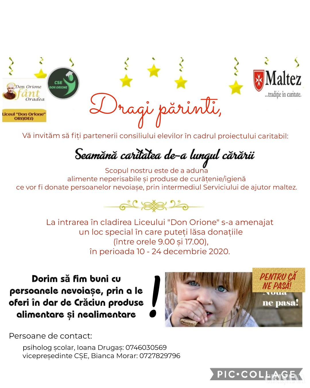 Astfel, în perioada 10 decembrie – 24 decembrie, Consiliul școlar al elevilor de la „Don Orione” a amenajat, la intrare în liceu (str. Cazaban, nr. 49/E, Oradea), un spațiu, accesibil între orele 9.00 - 17.00, în care cei care doresc pot lăsa donații (alimente neperisabile și produse de curățenie/igienă) pentru persoanele nevoiașe.