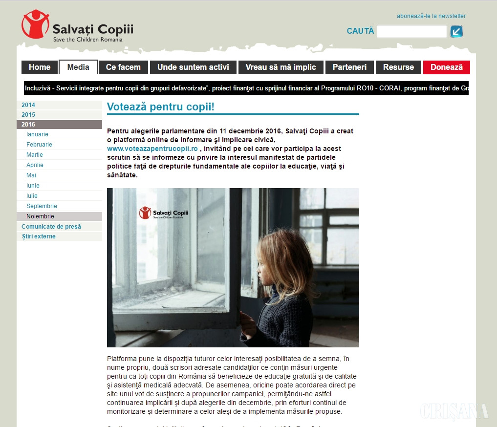 Potrivit organizației, platforma www.voteazapentrucopii.ro va monitoriza constant ponderea pe care politicile publice privind protejarea copilului în cele două componente majore, educația și sănătatea, o au în ofertele electorale ale competitorilor pentru alegerile legislative care vor avea loc în 11 decembrie.