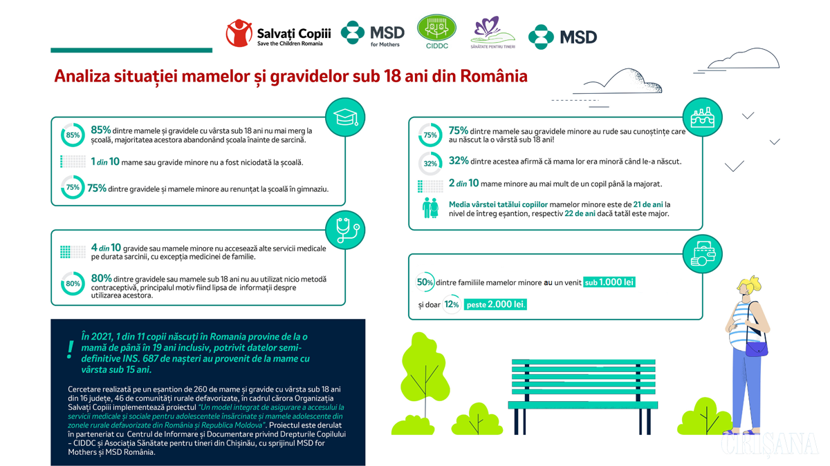 Mai mult de opt din zece mame și gravide cu vârsta sub 18 ani nu mai merg la școală, iar patru din zece gravide și mame minore nu accesează alte servicii medicale, cu excepția medicinii de familie, pe durata sarcinii, potrivit datelor unei analize a situației mamelor și gravidelor sub 18 ani din România, realizată de Organizația Salvați Copiii.