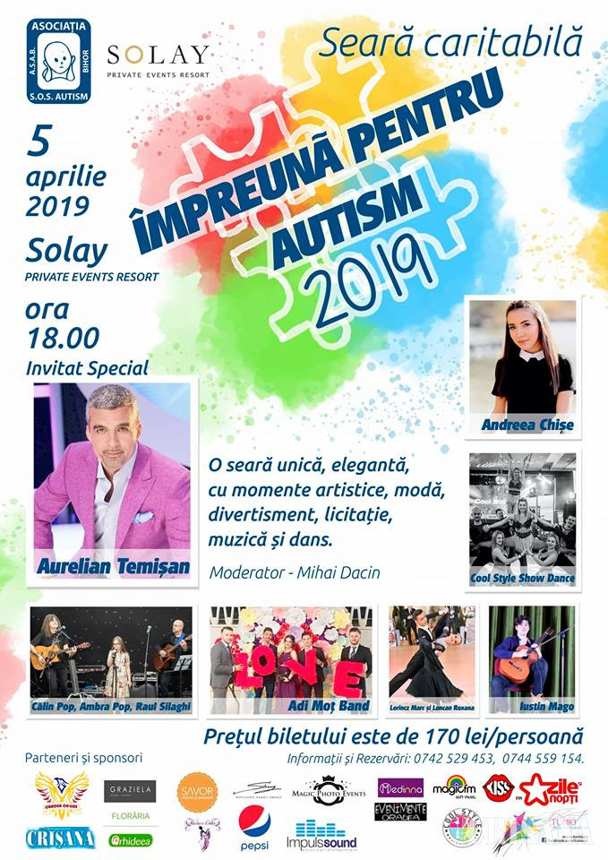 Ca în fiecare an, în preajma acestei zile, asociația invită orădenii la seara caritabila ,,Împreună pentru autism''. De această dată, evenimentul va avea loc în data de 5 Aprilie, de la ora 18.00, la sala de evenimente Solay.