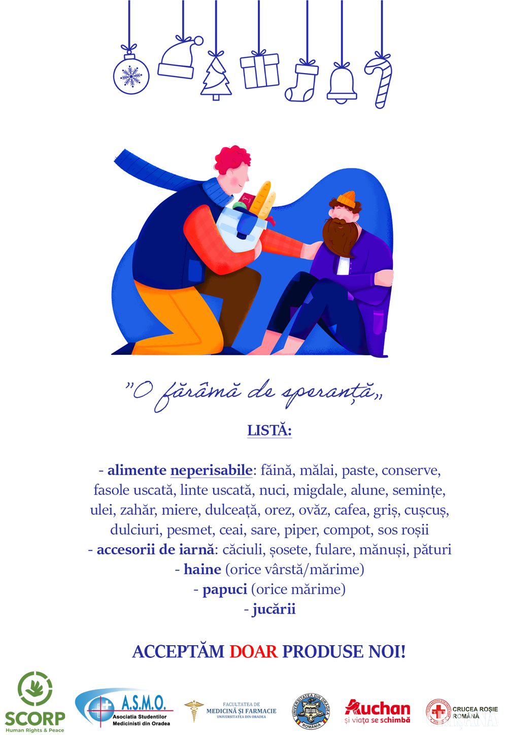 Pentru a oferi tuturor celor care sunt singuri de Crăciun o cât de mică bucurie, studenții de la Asociația Studenților Mediciniști din Oradea (ASMO) vor aduna alimente neperisabile și obiecte folositoare: căciuli, șosete groase, pături etc. Obiecte care vor fi dăruite apoi celor care au atâta nevoie de o mână de ajutor.